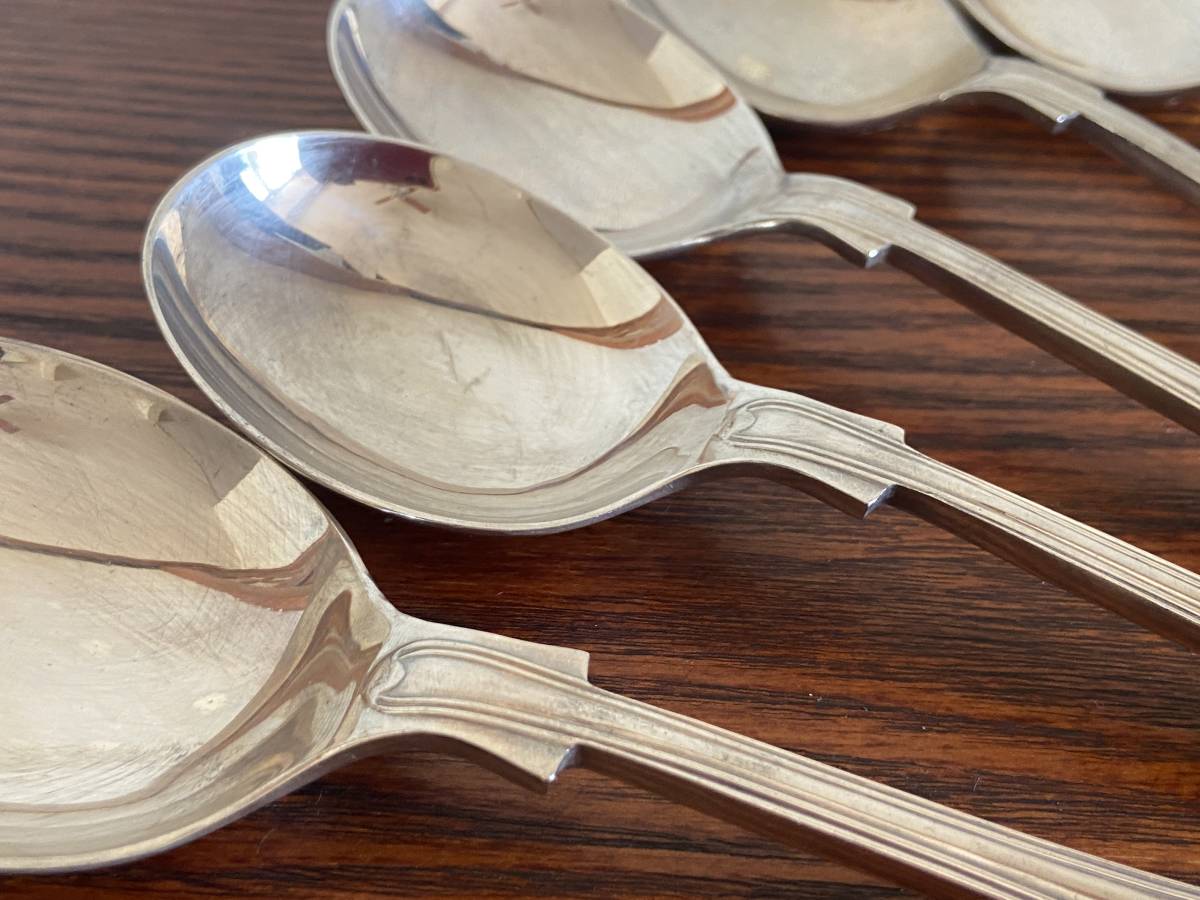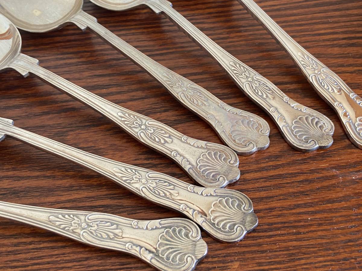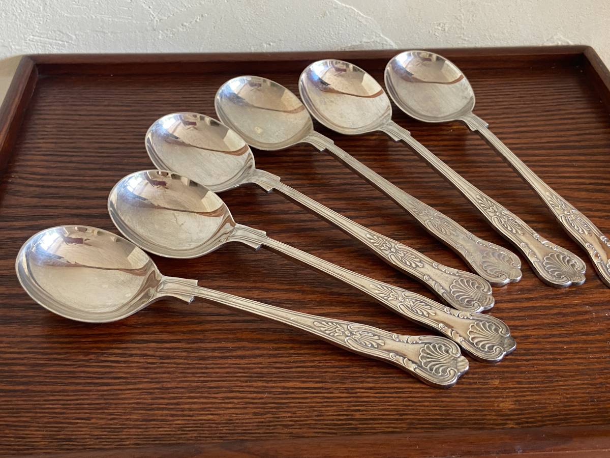 | イギリスビンテージ 伝統的なデザイン、キングスパターン 銀メッキ製カトラリーです。 スープスプーン 21cm 6本 全体的に細かな傷やわずかな汚れが見られます。 | |||