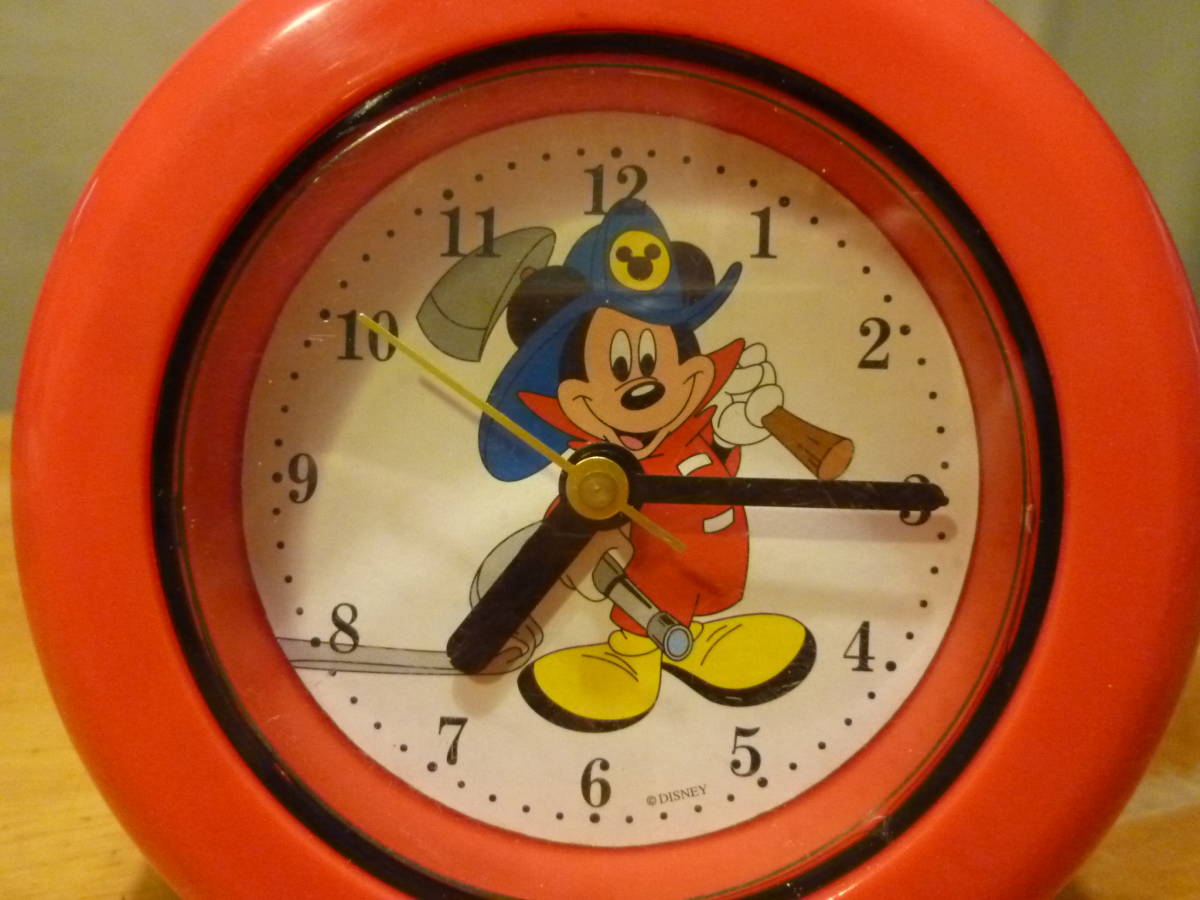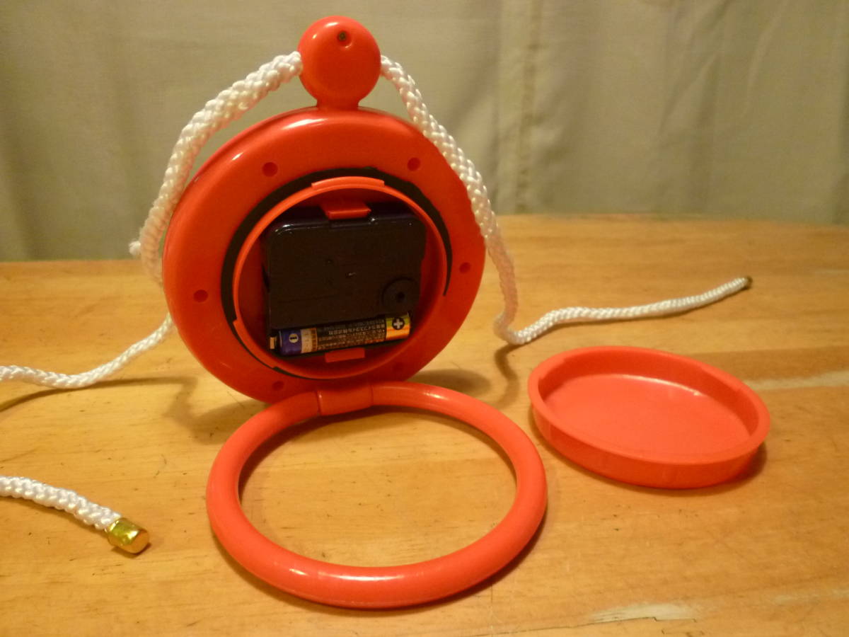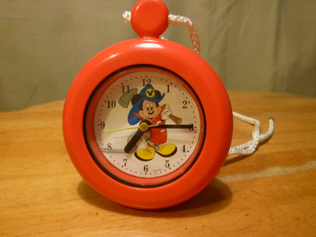 こちらは皆大好きなディズニーで、ミッキーの消防士さんスタイルのクロックの様です。文字盤にはホースを片手に斧を担いだミッキーが、後ろのリングを立てると据え置き型に、紐での吊り下げ等でも利用出来る様ですが、裏に使用の単三電池1本は別となり、裏のムーブメント(機動部)には平ゴム付きのネジ式カバーもありますが防水機能が完全かははっきりしません。