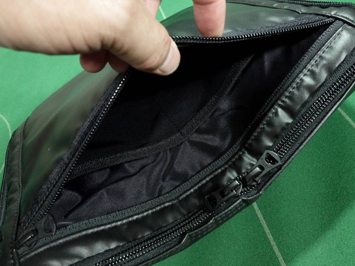 背面側には内部にストレッチメッシュポケットが2つあるジッパーポケット。