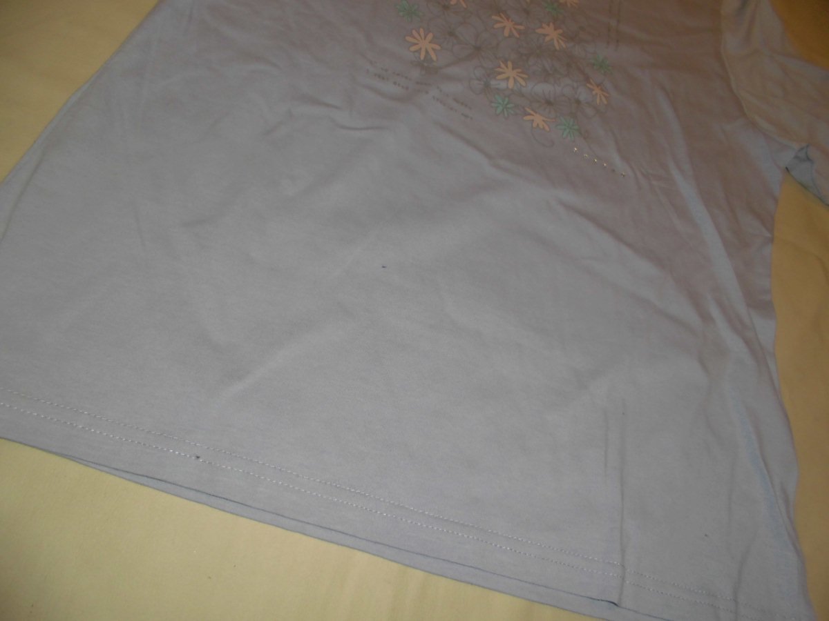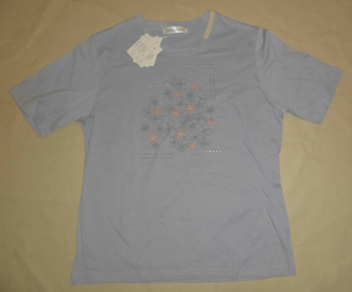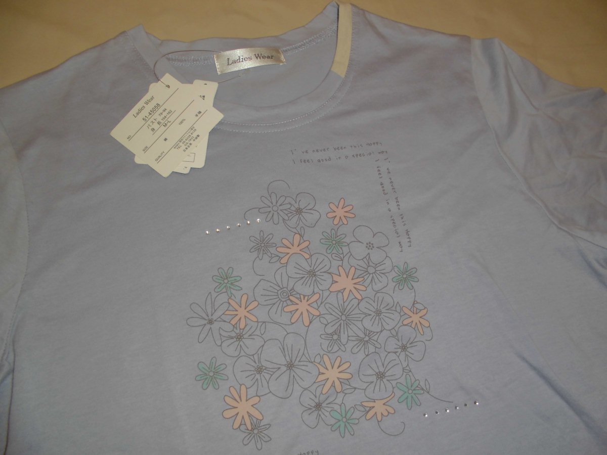プリントとラインストーンデザインのTシャツです。コットン100%で着心地の良いカットソーです。サイズはM~L表示で着丈61cm身幅48cmぐらいの実寸です。