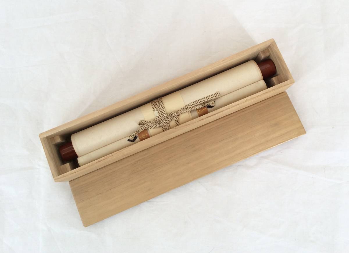 古い掛け軸は軸先を固定している接着剤が弱り、輸送途中の衝撃で軸先が外れてしまう場合がございます。