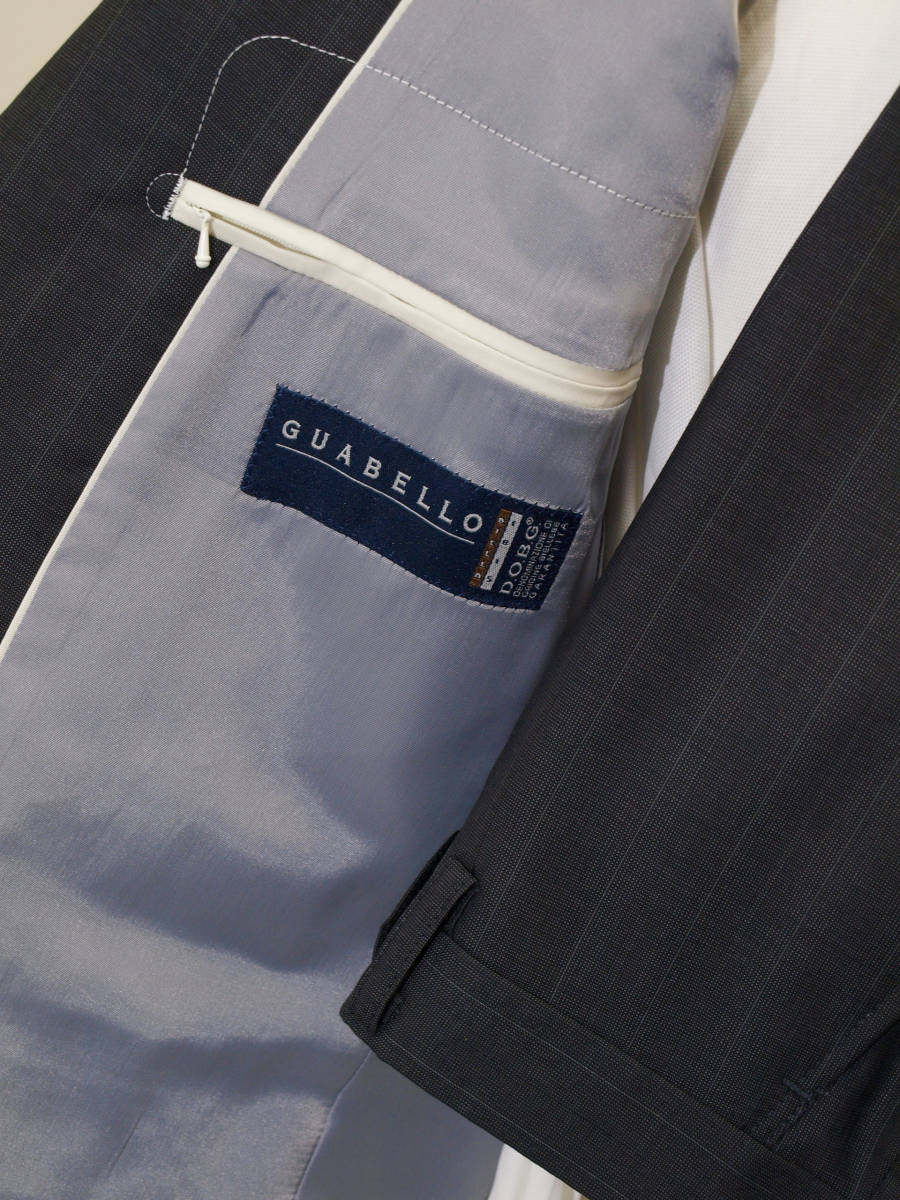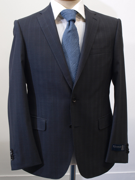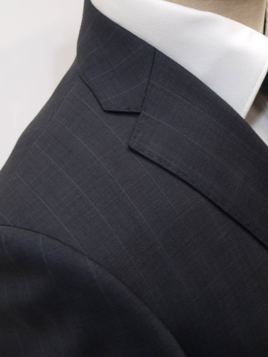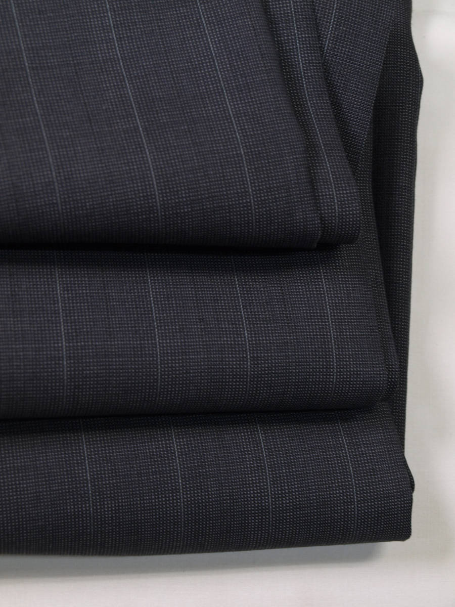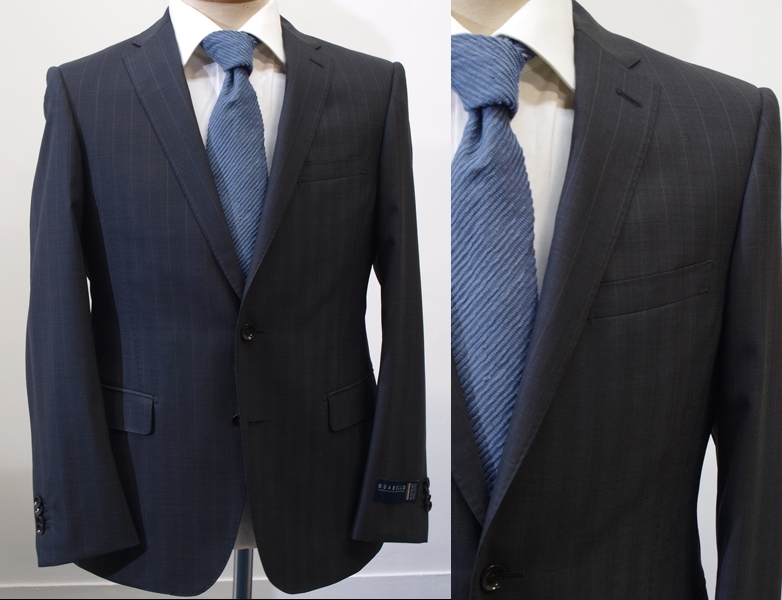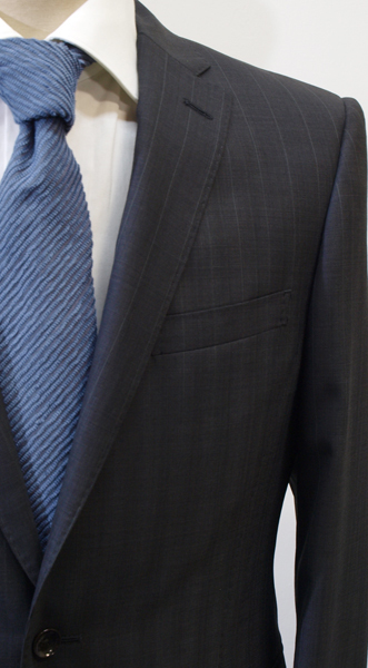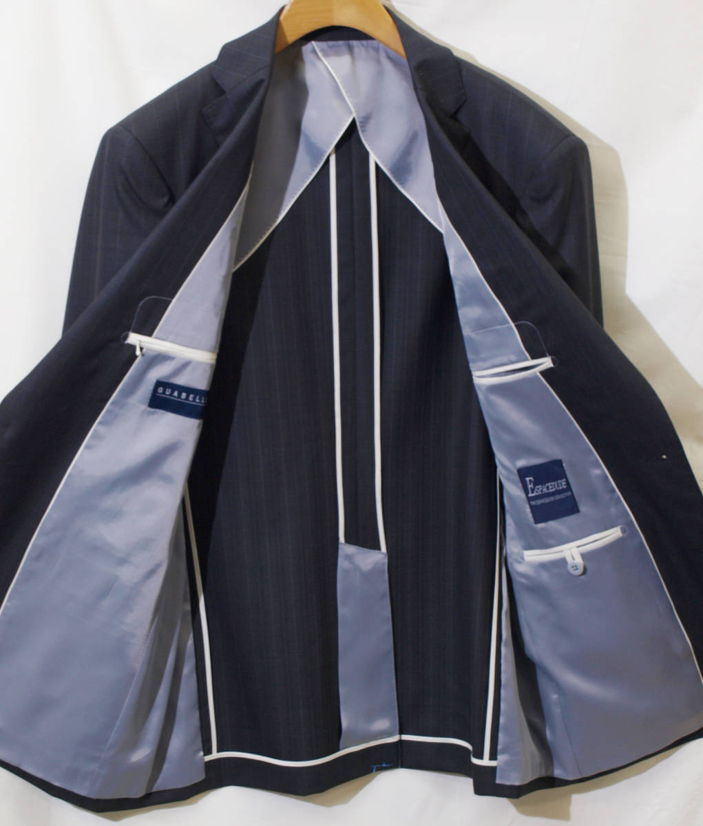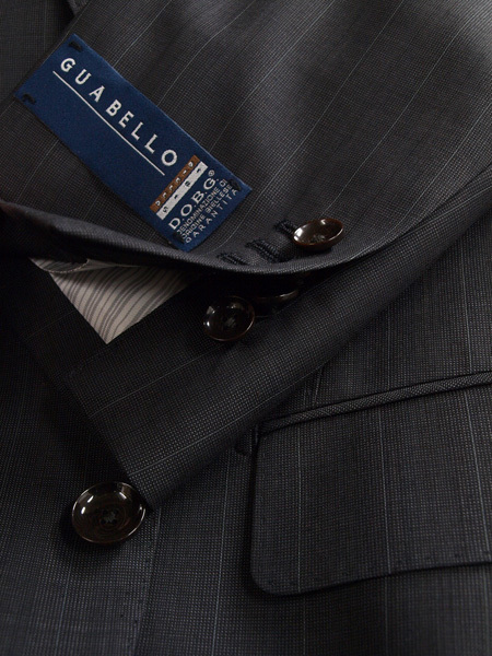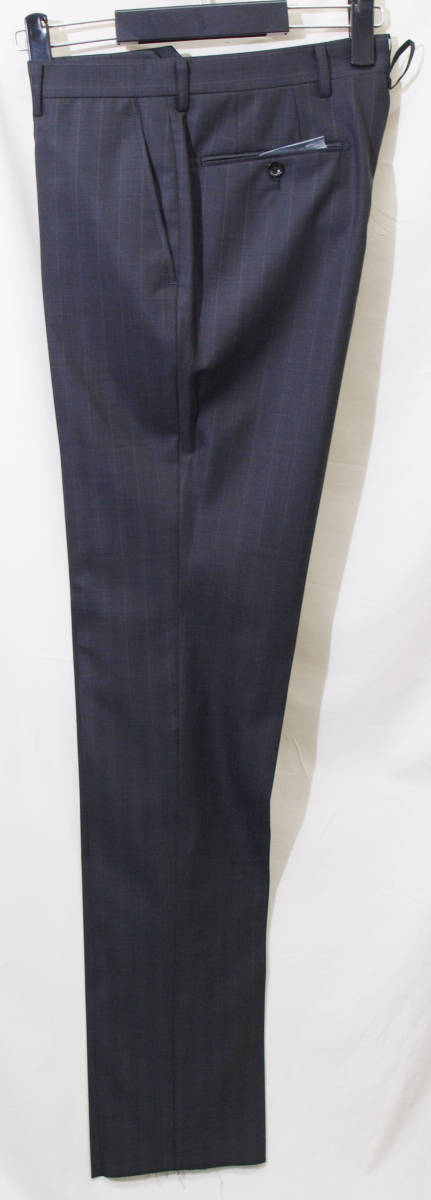 【サイズ】 A7 (ALL 相当) 目安の体型 身長175cm~185cm、ウエストサイズ84cm前後 【ジャケット実寸】 肩幅45.5cm 着丈72.5cm 袖丈63.5cm 脇下部分52cm 身幅48cm 【パンツ実寸】 ウエスト(胴回り実寸)84cm (平置きでかるくはかると84cmでひっぱってはかると86cmです。股上が浅めなので実寸が少し大きめに作られております。) わたり幅32.5cm(股下10cmの部位で29.5cm) 裾幅19.7cm 脇股上23cm 前股上25.5cm 股下95cm(裾上げしていない状態/新品) 【素材】 表地:ウール(毛)100% 裏地:胴裏/ポリエステル100% 袖裏/キュプラ100% ・イタリア、GUABELLO/グアベロ社の薄手でさらっとした触り心地でほどよいハリがある紳士スーツ向けの上質な細番手、サマーウール素材です。 【色】 濃いグレー 【柄】 ベースはピンヘッド織になっており2cm間隔でライトグレーのラインがはいったストライプ柄 【デザイン】 すっきりとしたコンパクトな印象の細身シルエット、タイトフィットスリム、ビジネススーツ新品、裾上げしていない状態です。 ・ジャケットはシングル2つボタンでスリムモデル ・パンツは股上が浅めで細いシルエットのノータックスリムパンツ 【縫製仕様】 ・ジャケット:シングル2つボタン、ノッチドラペル、襟元等AMFステッチ入り、袖口ボタン4つ(本切羽/本開き仕様)、センターベント、内ポケット3つ(小ポケット1つ含む)、背抜き(春夏シーズン対応) ・パンツ:ノータック、膝裏当て付き、脇ポケット斜め付け、後ろポケット左のみボタン付き、フロントはファスナーでボタン&ホック仕様/うちかけボタンあり/V字スリット 細部にわたりきちんとしたこだわりのあるきれいな縫製仕立てで仕上がっております。