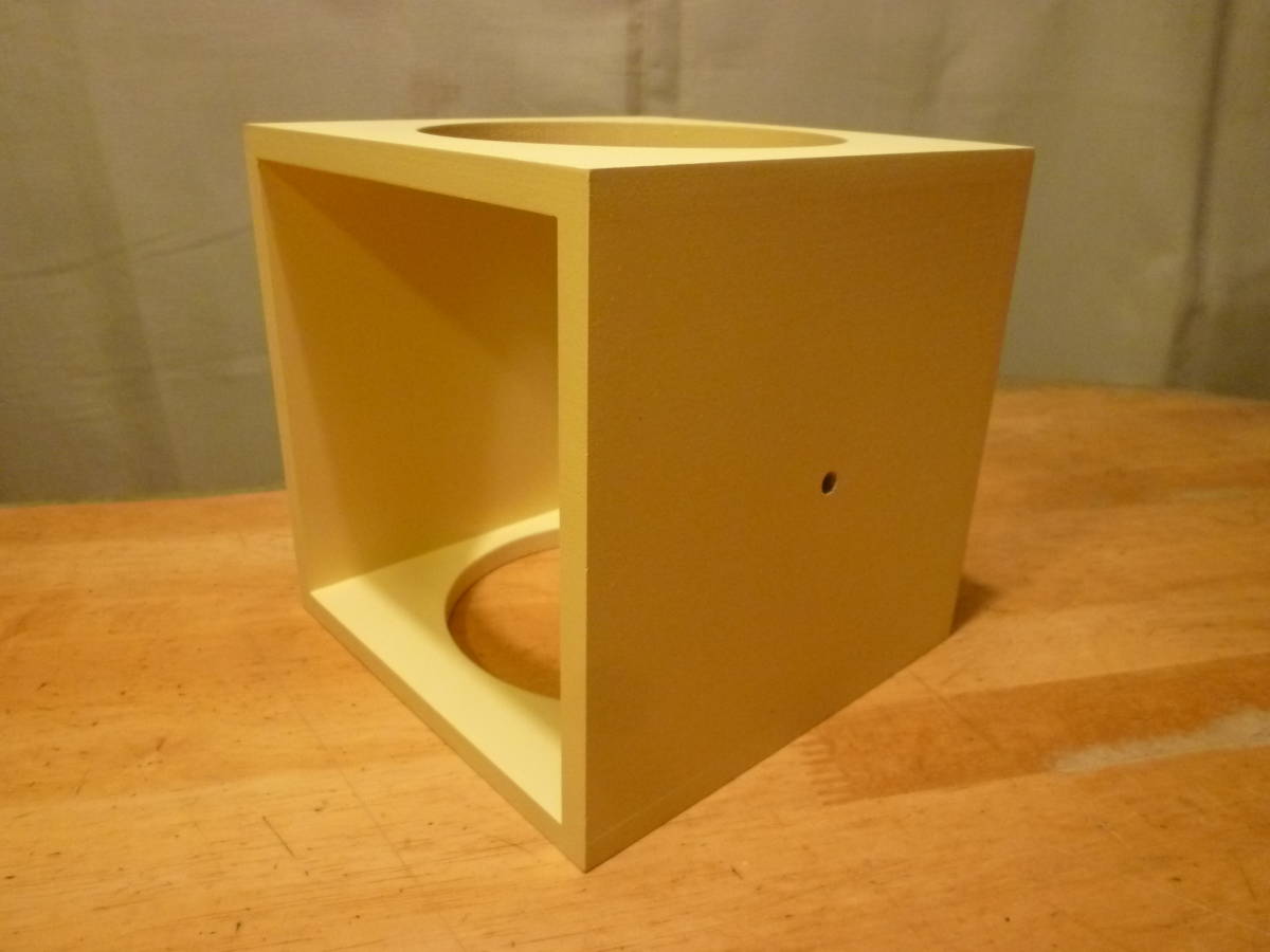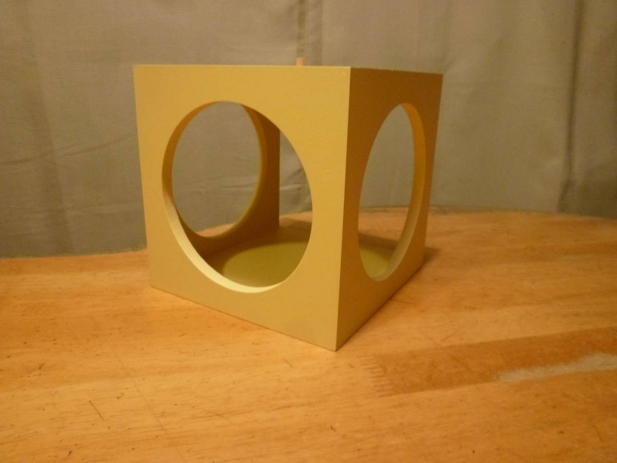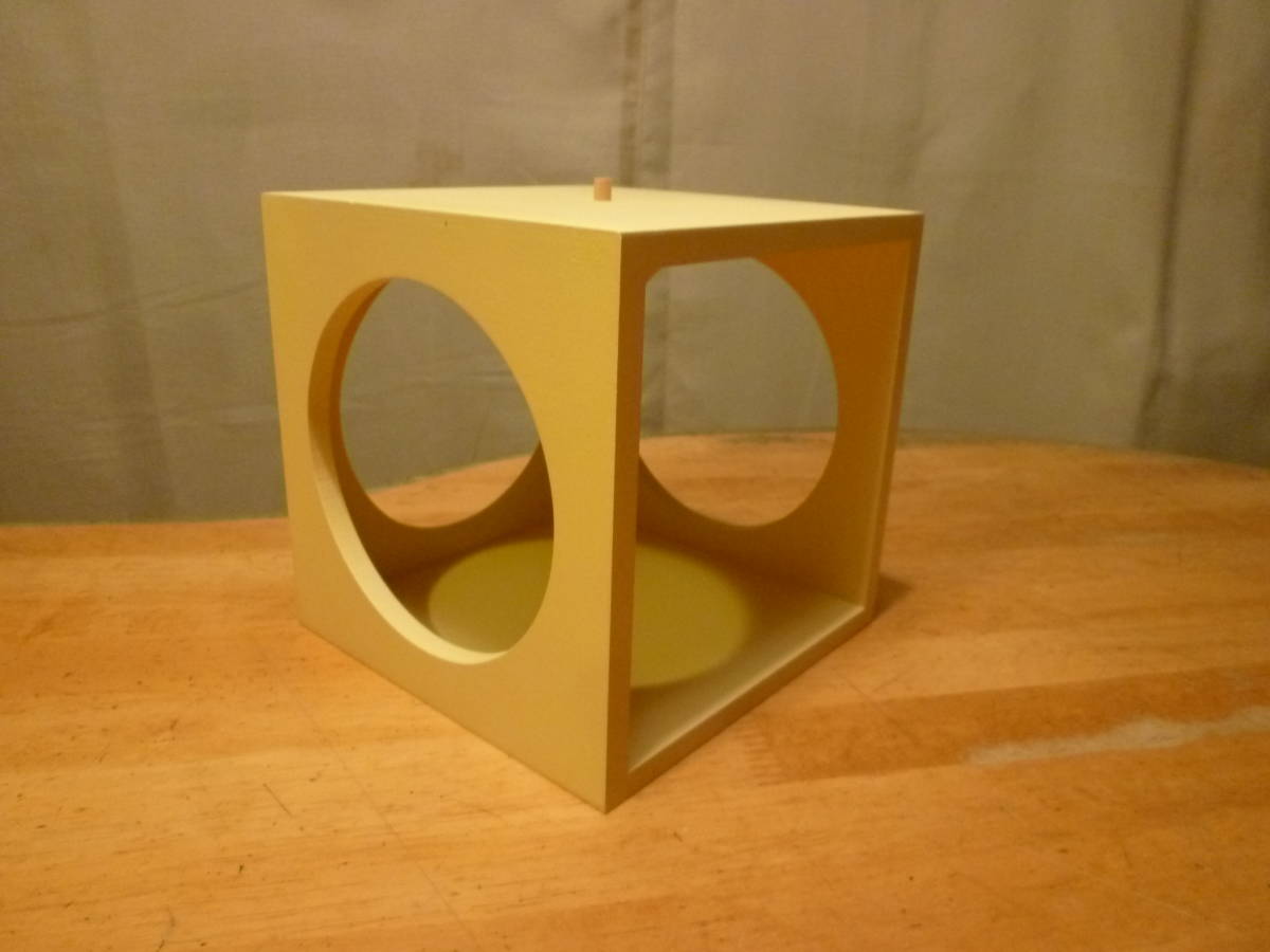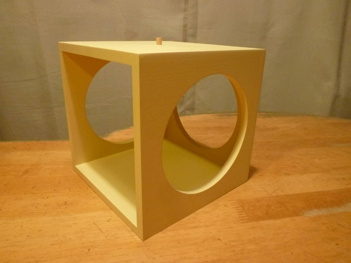 こちらは圧縮材?の様な素材だと思いますが、木製の飾りボックス?の様です。一辺は解放され他の三辺には円形のくり抜きが、そのままでも何かを中心に置いても素敵に映えると思います。上下中心部にピン穴と1個のピンがあり、上下に重ねてそのセット用のものかもしれませんがはっきりしません。