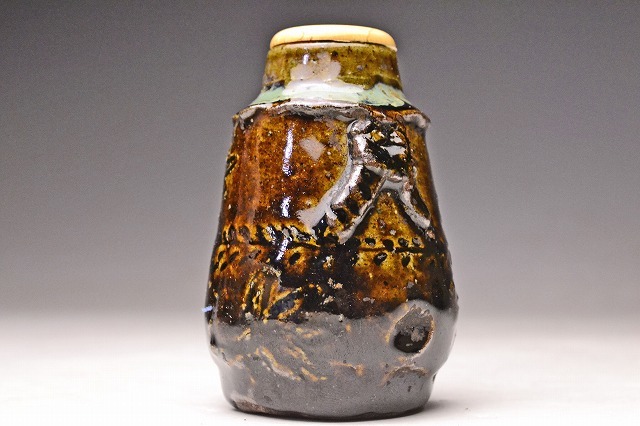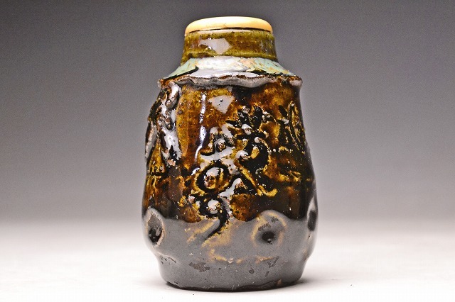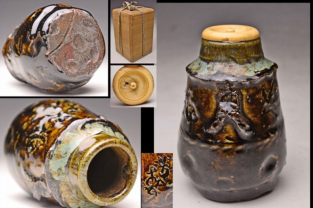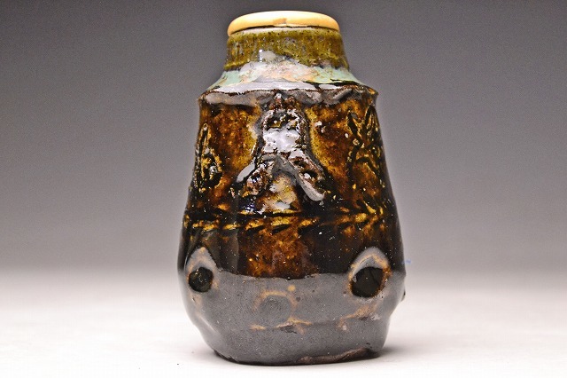 独特の 造形に 肩に流れた 緑釉 飴釉の 景色が 素晴らしい 逸品です。