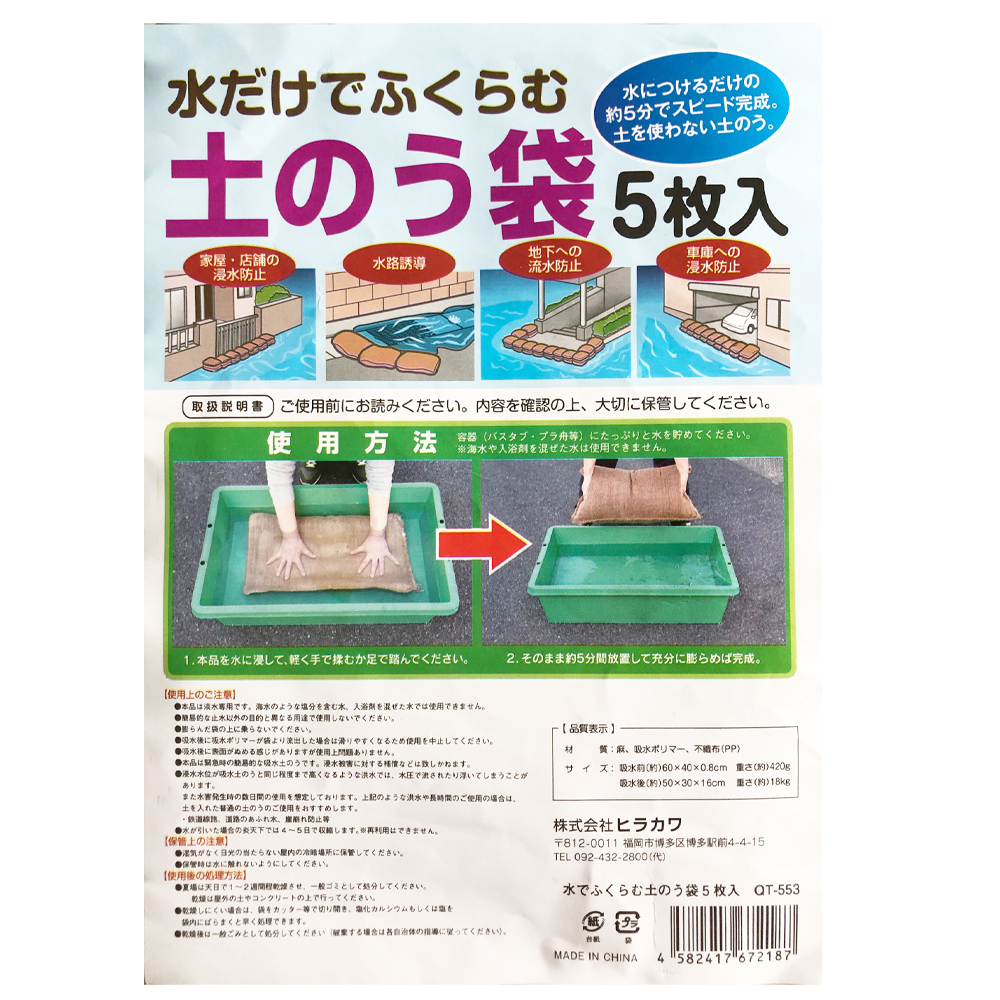 【水だけでふくらむ土のう袋 5枚入】浸水防止や流水防止に 緊急時のための備えとしても【未使用品】