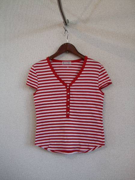 商品紹介 | 赤×白のボーダーカットソーです。 襟元はV字のヘンリーネックでシルバーのボタンがポイントになっています。 《素材》 綿100% |