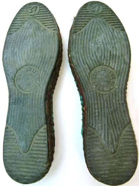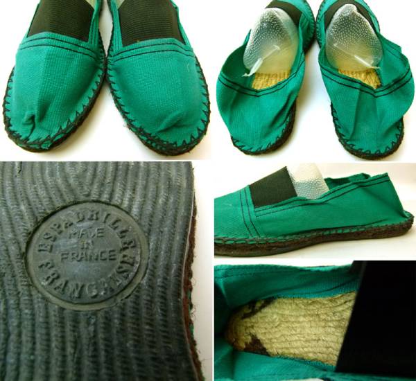 素材はキャンバス。色はグリーン。フランス製2トーンエスパドリーユサンダル。Espadrille(エスパドリーユ)はジュート麻などの軽い縄底に、綿キャンバス地などでラフに甲部を覆った、スリッポン型の靴。フランスやスペインの船乗りや港湾労働者などが海辺で使用していたわらじ風サンダルです。(かかとを踏んで履くタイプのサンダルです)※実寸サイズはインソールを計測の上、cm相当と表記させていただいております。送料は600円(沖縄・離島は1200円) |