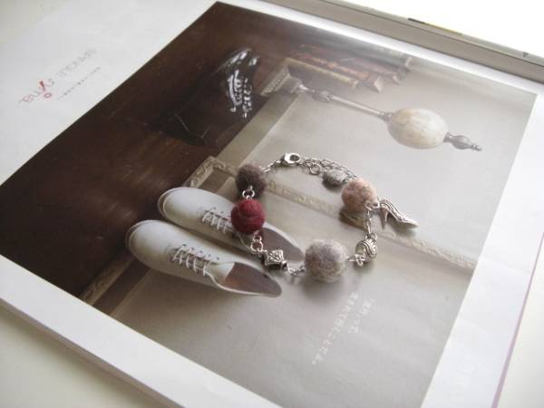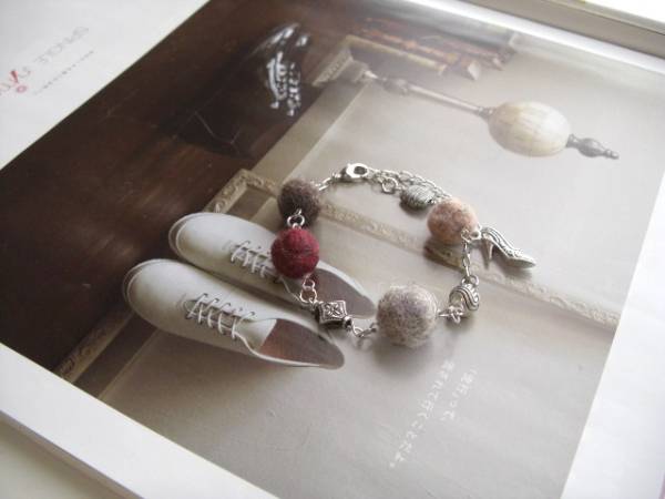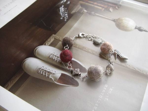 魔法にかけられて・・シリーズです♪秋色の巴里・・ふんわりやさしいフェルト玉のブレスレットです♪モーヴピンクやグレー、モスブラウンやベージュなどシックな色のフェルト玉にデザインメタルを合わせてキュートな表情です♪フェルト玉は12ミリから14ミリ位までの大きさ違いです♪メタルチャームは8ミリから10ミリ位までのデザイン違いです♪長さは全長23センチ位で調節自由です♪お揃いのネックレスも出品しています♪シンプルで飽きのこないいつまでも着けられるデザインを考えて作りました!ハンドメイドをご理解頂いてノークレーム、ノーリターンでお願いします