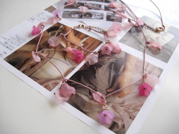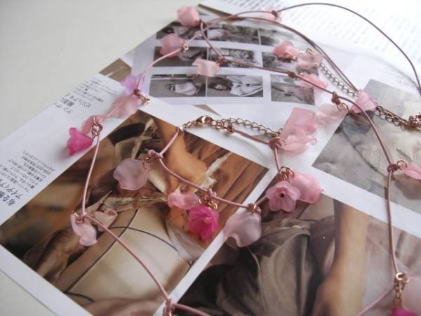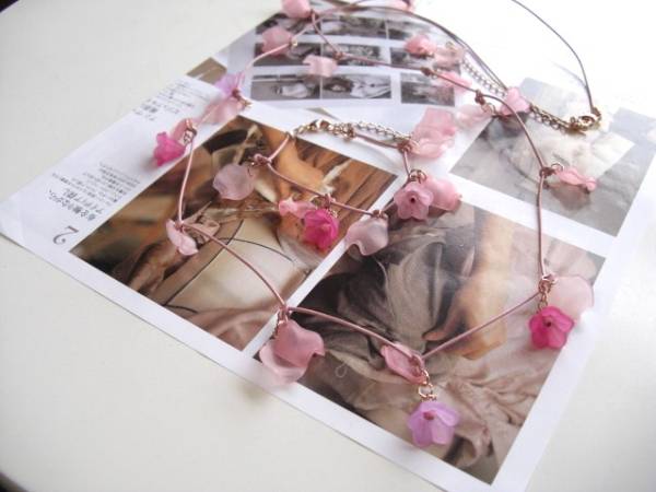 春の予感・・シリーズです♪花びらを紡いでⅡ・・大人っぽいサーモンピンクやライト・パープルなど表情の違うアクリルの花びらのネックレスとブレスレット2点セットです♪サーモン・ピンクのレザー・コードで紡いでやさしい表情です♪花びらやお花は12ミリ位です♪ネックレスは94センチ+アジャスター14センチで最長108センチ位です♪2連にされても素敵です♪ブレスレットは16センチ+アジャスター6センチで最長22センチ位です♪単品やお揃いのピアスも出品しています♪♪シンプルで飽きのこないいつまでも着けられるデザインを考えて作りました!ハンドメイドをご理解頂いてノークレーム、ノーリターンでお願いします