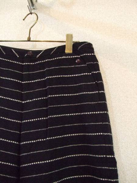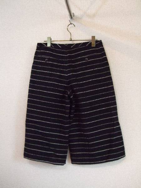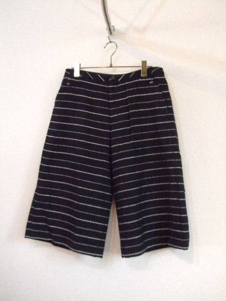 | 商品紹介 | 紺の地色に白い糸が織り込まれたボーダーパンツです。 7分~8分丈位の長さで、裾に向かって広がる形です。 ウール混のやや厚手でしっかりした生地です。 《素材》 表地:毛54% ポリエステル22% レーヨン16% アクリル4% ナイロン4% 裏地:ポリエステル100% |