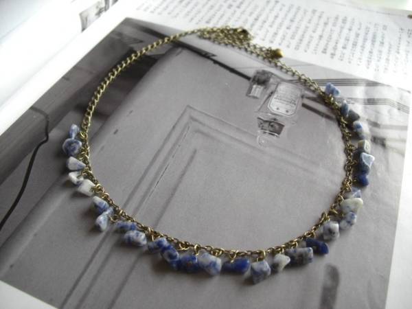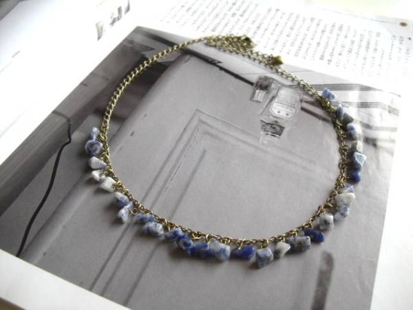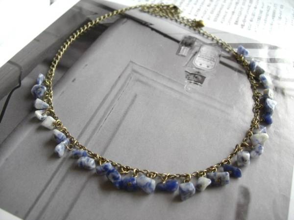 早春の薔薇・・シリーズです♪デニムラピスと白い鳥・・爽やかなラピスのネックレスです♪深い藍色やブルーグレーや群青色がアートな表情のデニムラピスは3ミリから6ミリ位のさざれです♪ランダムに繋いで可憐な表情です♪ネックレスの長さは全長55センチ位で調節自由です♪♪チョーカー風にされても素敵です♪お揃いのネックレスやブレスレットも出品しています♪♪シンプルで飽きのこないいつまでも着けられるデザインを考えて作りました!ハンドメイドをご理解頂いてノークレーム、ノーリターンでお願いします