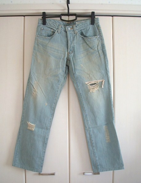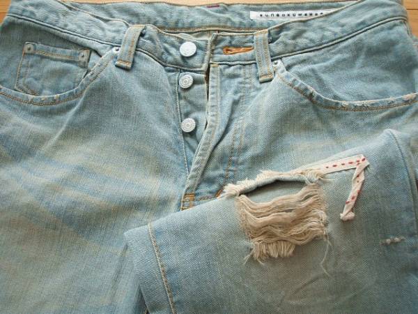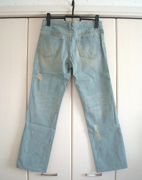 スナオクワハラ ライトブリーチダメージデニム(未使用)です。 お色 ライトブルー サイズ S ウエスト幅約37cm、ヒップ幅約48cm、股上約21㎝、股下約74.5cm 腿幅約29cm、裾幅約20㎝ 少しゆったりめのストレートパンツです。 開きはボタンフライです。 素材 綿100% やや薄手の春夏向き素材で、所々にダメージ加工がされています。 横糸のみの個所は肌が透けて見えます。 多少たたみじわがありますが良い状態です。 美品ではありますが、一度は個人が所有した物ですので 見落とし等があるかもしれません。 御理解頂ける方のみ入札お願いします。 他にもいろいろ出品しています。 |