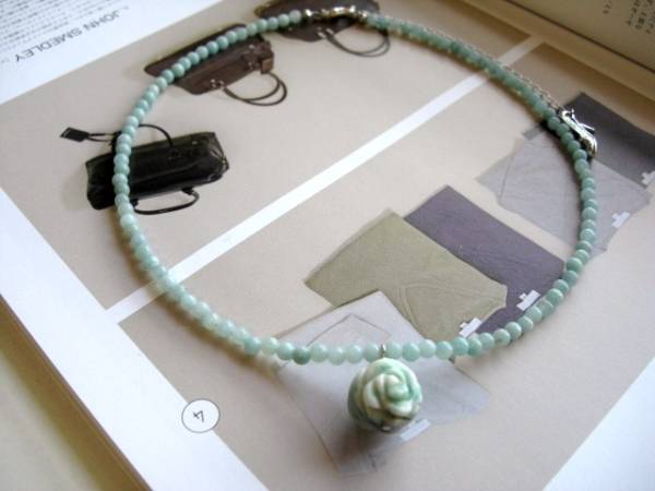 ロゼッタの宝石箱・・シリーズです♪5月の水色・・神秘的なアマゾナイトのネックレスです♪トップに翡翠の薔薇を合わせて儚げにロマンチックしています♪アマゾナイトは4ミリの丸玉です♪翡翠の両面薔薇は14ミリ位です♪長さは42センチ+アジャスター10センチで 最長52センチくらいです♪お揃いのブレスレットも出品しています♪シンプルでいつまでも着けられるデザインを考えて作りました!♪ハンドメイドをご理解頂いてノークレーム、ノーリターンでお願いします