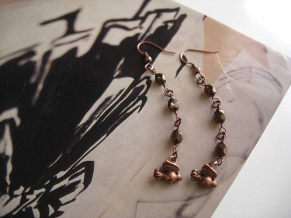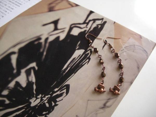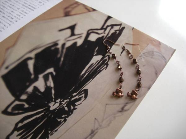 アンニュイ気分で・・シリーズです♪秋の小鳥さん・・シックなブロンズ色のチェコビーズと小鳥さんのピアスです♪ブロンズ色のチェコビーズ と小さな小鳥さんがネオ・ロマンチックしています♪5ミリ位のチェコビーズは同じブロンズ色の小さな小鳥さ んのメタルチャームを合わせました♪長さは7・5センチ位です♪イヤリングにも変更出来ます♪お揃いのネックレスやブレス レットも出品しています♪シンプルで飽きのこないいつまでも着けられるデザインを考えて作りました♪ハンドメイドをご理解頂いて ノークレーム、ノーリターンでお願いします