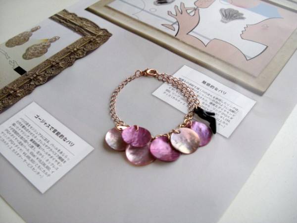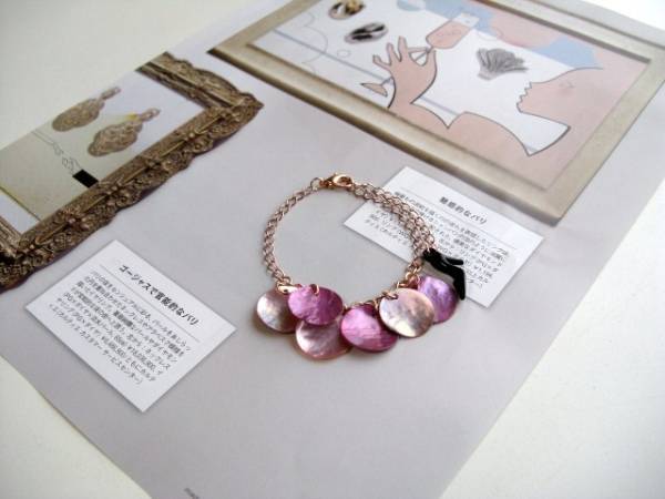 春の予感・・シリーズです♪薔薇色の帽子・・薔薇色のシェルのブレスレットです♪モーヴピンクやベージュピンク、淡いピンクのシェルにピンクゴールドのチェーンを合わせて可憐な表情です♪シェルは18ミリ位です♪長さは全長23センチ位で調節自由です♪お揃いのネックレスやピアスも出品しています♪シンプルで飽きのこないいつまでも着けられるデザインを考えて作りました!ハンドメイドをご理解頂いてノークレーム、ノーリターンでお願いします