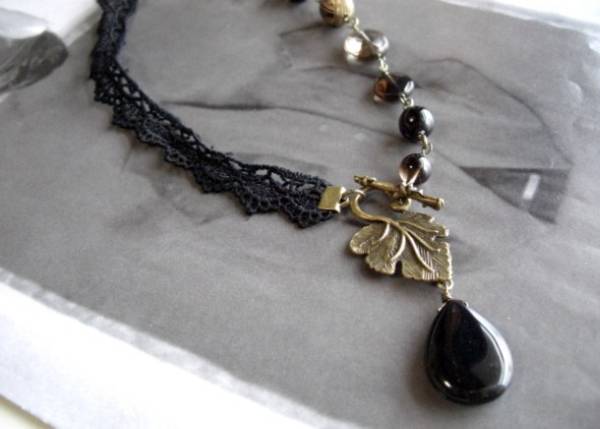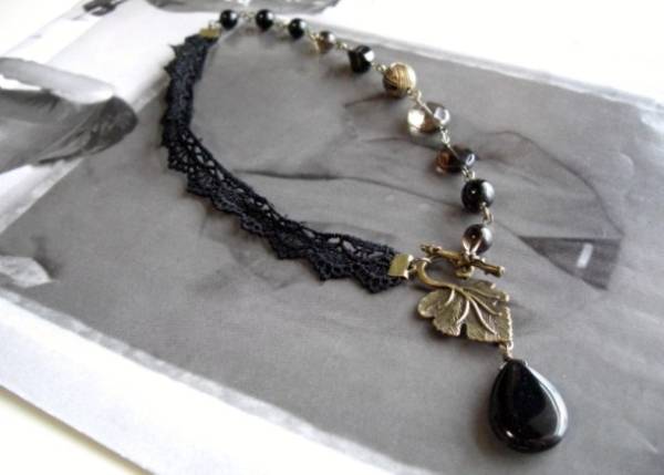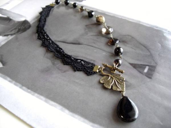 巴里色・デッサン・・シリーズです♪オニキスと黒レース・・シックなオニキスのネックレスです♪丸玉やドロップのオニキスにスモーキークォーツや黒のレースや葉っぱのトグルを合わせてさりげなく華やかな表情です♪オニキスは8ミリ、10ミリの丸玉、16ミリのツイストオーバル、27×18ミリのフラットドロップです♪コインカット、オーバル、丸玉などデザイン違いのスモーキークォーツを合わせました♪長さは全長40センチ位でトップは6・5センチ位です♪同じデザインの長いタイプのネックレスやブレスレットも出品しています♪シンプルで飽きのこないいつまでも着けられるデザインを考えて作りました!ハンドメイドをご理解頂いてノークレーム、ノーリターンでお願いします