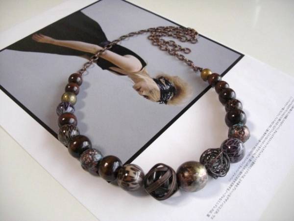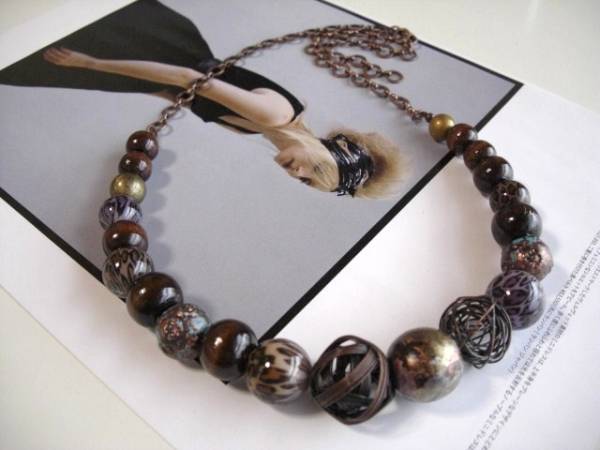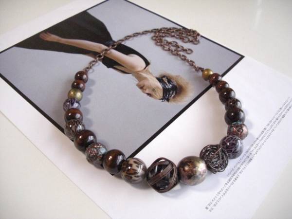 秋色・クローゼット・・シリーズです♪異素材マニア・・キュートな異素材のネックレスです♪ブラウン系のウッドやゼブラ柄の樹脂、ワイヤーボールなどの異素材を集めてロマンチックな表情です♪10ミリから20ミリ位までのウッド、デザイン樹脂ビーズやワイヤーボールにデザインチェーンを合わせました♪長さは全長70センチ位で調節自由です♪チョーカー風にされても素敵です♪お揃いのブレスレットも出品しています♪シンプルで飽きのこないいつまでも着けられるデザインを考えて作りました♪ハンドメイドをご理解頂いてノークレーム、ノーリターンでお願いします
