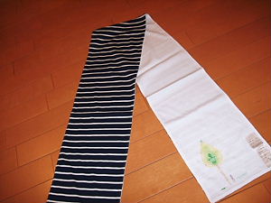 新品即決、千趣会のカットソー素材のマフラー、ネイビー×白のボーダー面と白にイラストのデザインされた面があります。素材はカットソー素材で肌さわり抜群です。大きさは20×140、ウールのものなどとは異なり、やさしい肌さわりで、さっそく秋からでも使っていただけます。。