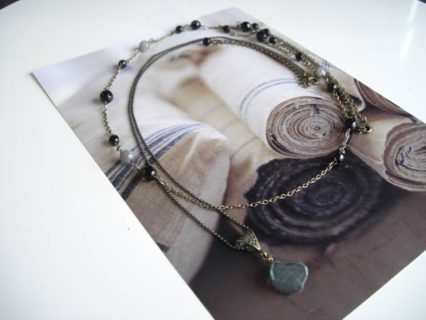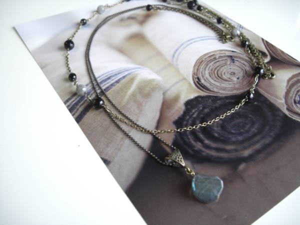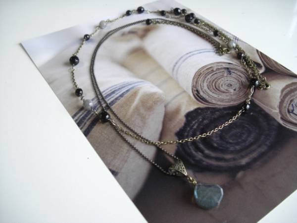 セシル・スタイル・・シリーズです♪恋する人・・シックなオニキスとラブラドライトのネックレス2点セットです♪漆黒のオニキスに神秘的なラブラドライトの丸カットやコインカットを合わせてロマンチックな表情です♪6ミリ、8ミリのラウンドカットのオニキスには8ミリのラブラドライトを合わせました♪長さは90センチ+アジャスター12センチで最長102センチ位です♪2連にされても素敵です♪16ミリのコインカットのラブラドライトにはクラシカルな座金やボールチェーンを合わせました♪長さは66センチ+アジャスター12センチで最長78センチ位です♪それぞれ単品やブレスレットも出品しています♪シンプルで飽きのこないいつまでも着けられるデザインを考えて作りました♪ハンドメイドをご理解頂いてノークレーム、ノーリターンでお願いします
