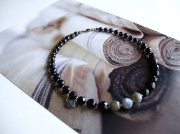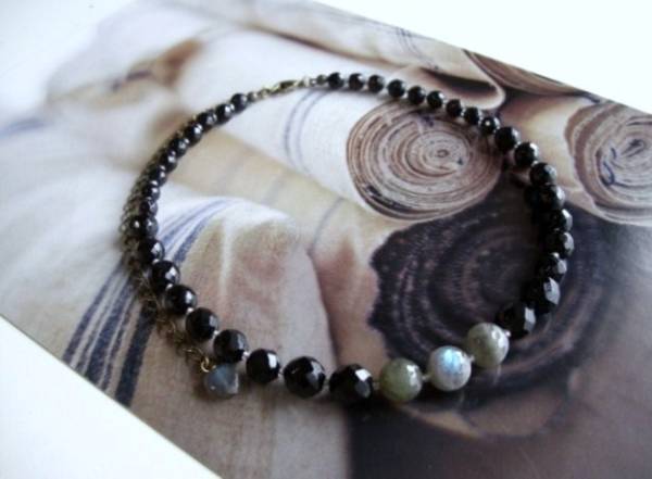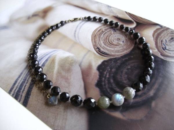 セシル・スタイル・・シリーズです♪恋する人・・シックなオニキスとラブラドライトのネックレスです♪漆黒のオニキスに神秘的なラブラドライトの丸カットを合わせてロマンチックな表情です♪6ミリ、8ミリ、10ミリのラウンドカットのオニキスには10ミリのラウンドカットのラブラドライトを合わせました♪長さは36センチ+アジャスター15センチで最長51センチ位です♪チョーカー風にされても素敵です♪お揃いのネックレスやブレスレットも出品しています♪シンプルで飽きのこないいつまでも着けられるデザインを考えて作りました♪ハンドメイドをご理解頂いてノークレーム、ノーリターンでお願いします