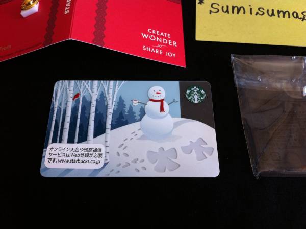 また、オマケとして「 スターバックスカード 2013. ホリデー 雪だるま 」もお付けします。(残高は0円です。)
