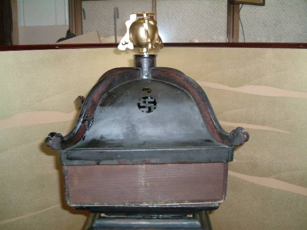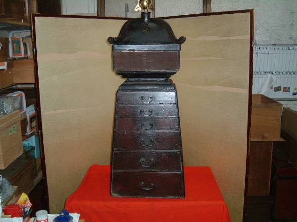 「時代香時計M163」 香時計は「常香盤」といわれる仏具 大変大きく250年前程のお品です。 年号は宝暦年号となります。 寛延の後、明和の前 。1751年から1763年までの期間を指す サイズは角錐形の43cm×43cm高さ115cmです。 引き出し6個付きの立派なお品です。 リメークして有ります。 (一口メモ) お線香やお香の燃焼速度はかなり正確です。その性質を利用して古代から時計代わりに利用されてきました。本来の香時計では、香炉に抹香(粉末のお香)を筋状に敷き、その上に一定の間隔を開けて垂直方向に糸を掛けます。一方は固定、反対側には金属製の重りが下げられています。お香の端に着火すると燃焼が進み、糸の下に燃焼部が来ると糸が焼き切れて重りが落下し、香炉の下に置いた銅鑼が鳴る、これが時報です。用意に手間が掛かる上、大掛かりなもので有った様です。 |