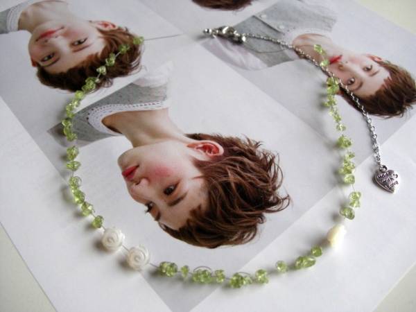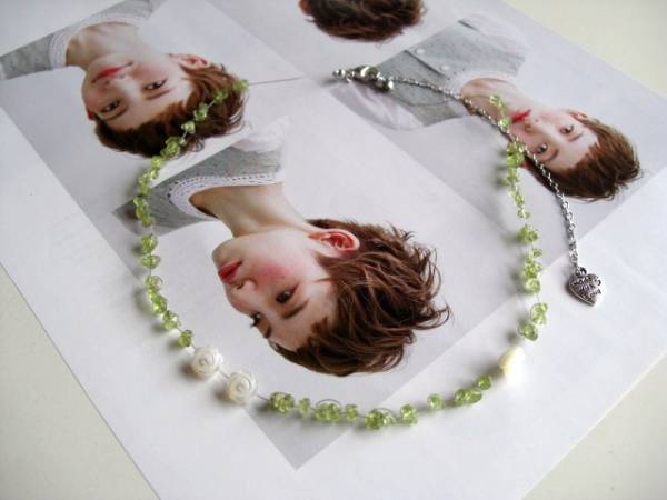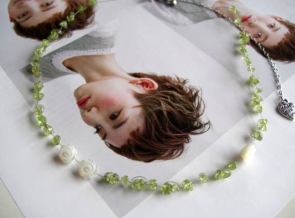 6月の花嫁・・シリーズです♪ペリドットと白い薔薇・・神秘的なダークグリーンのペリドットのネックレスです♪透明なテグスに丸みを帯びた3ミリから5ミリ位までのさざれや白蝶貝の薔薇をランダムに繋いで可憐な表情です♪長さは40センチ+アジャスター12センチで最長52センチ位です♪チョーカー風にされても素敵です♪お揃いのブレスレットも出品しています♪シンプルで飽きのこないいつまでも着けられるデザインを考えて作りました!ハンドメイドをご理解頂いてノークレーム、ノーリターンでお願いします
