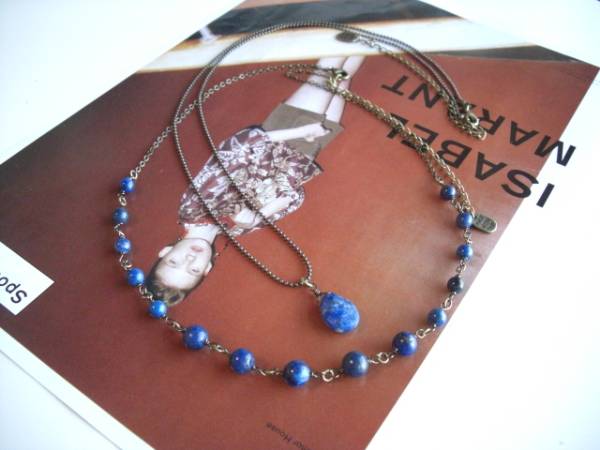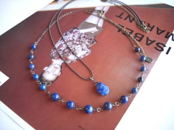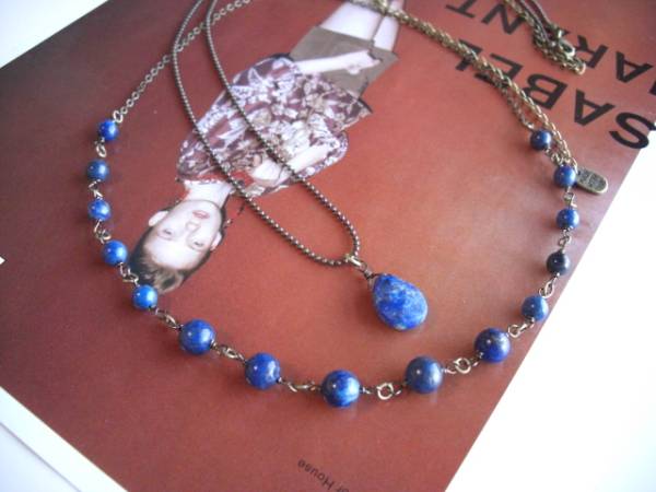 クレアの幸せ・・シリーズです♪藍色デッサン・・可憐なラピスラズリのネックレス、2本セットです♪丸玉やフラットドロップのラピスがさりげなく華やかな表情です♪6ミリ、8ミリの丸玉のラピスのネックレスは52センチ+アジャスター13センチで最長65センチ位です♪12×17ミリのフラットドロップのラピスは華奢なボールチェーンを合わせました♪長さは68センチ+アジャスター12センチで最長80センチ位です♪単品やブレスレット、ピアスも出品しています♪シンプルで飽きのこないいつまでも着けられるデザインを考えて作りました!ハンドメイドをご理解頂いてノークレーム、ノーリターンでお願いします