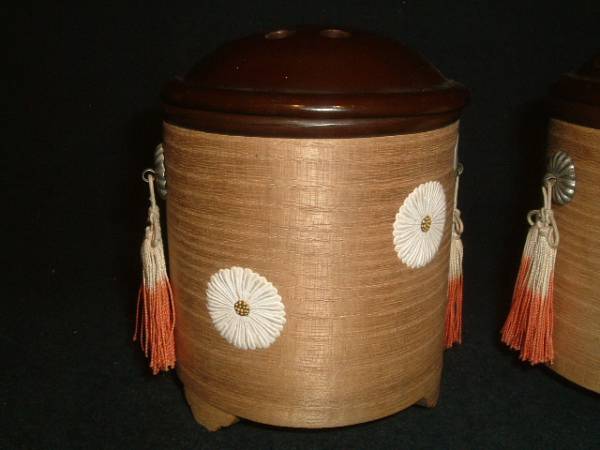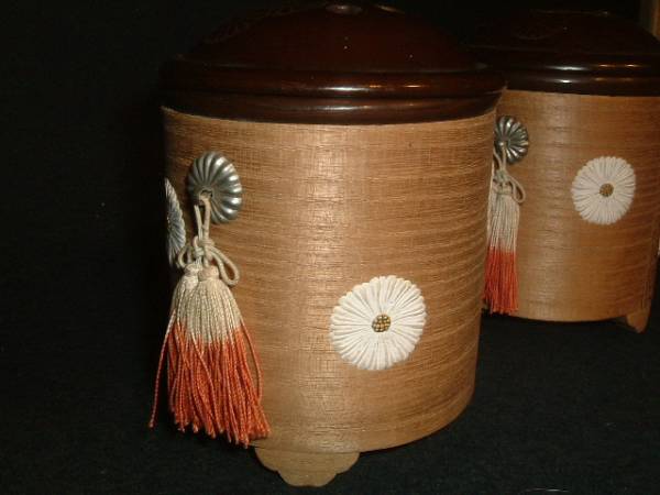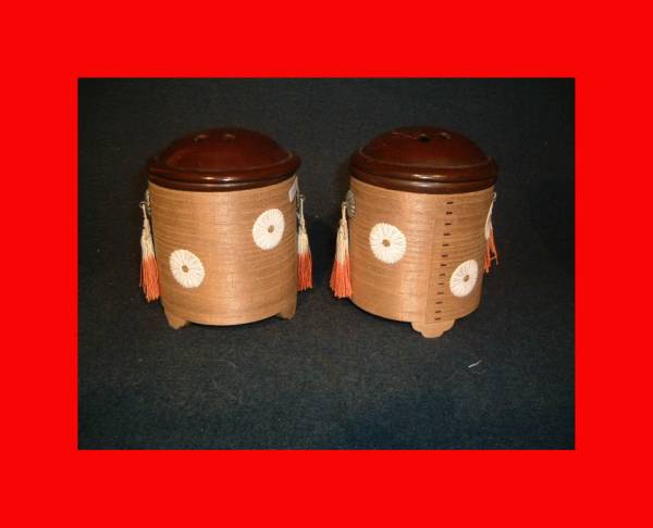「薫衣香M15」 菊置きの有職薫衣香1対です。 外具は桐の曲げ物で手の込んだ菊置きして有ります。 1対ですが1個の蓋にヒビ、直し有ります。 直径9.5cm高さ12cm (一口メモ) 衣に焚き染める「薫衣香」(くの えこう) 衣服に香りを薫きしめる道具として用いられたものに“伏籠(ふせご)”とよばれるものがあります。 灰を盛った香炉に火をくべて香をくゆらせ、竹や木製の枠に網をはめこんで作られた伏籠を被せます。 その上に衣類をひろげ、立ち上ってくる芳ばしい薫煙を染み込ませる仕掛けでした。 |