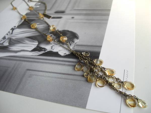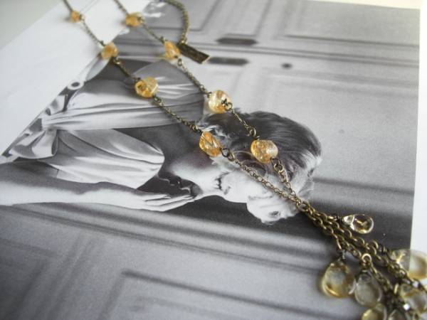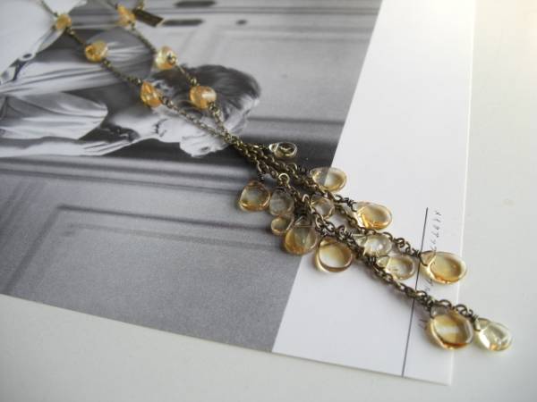 クレアの衣装箱・・シリーズです♪琥珀色の夢・・可憐なシトリンのネックレスです♪ペアシェイプやラフタンブルなどデザイン違いのシトリンを集めて儚げな表情です♪シトリンは9×6ミリ~11×8ミリのペアシェイプ、9ミリから11ミリ位のラフタンブルです♪ラリエット風のデザインです♪♪長さは70センチ+アジャスター12センチで最長82センチ位です♪トップは10センチ位です♪ブレスレットやイヤリングも出品しています♪シンプルで飽きのこないいつまでも着けられるデザインを考えて作りました!ハンドメイドをご理解頂いてノークレーム、ノーリターンでお願いします