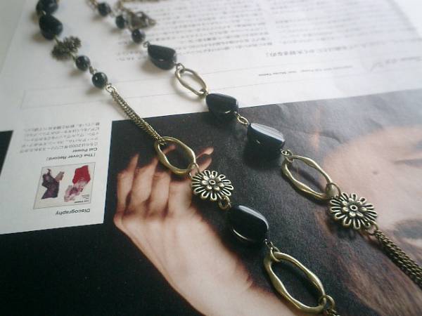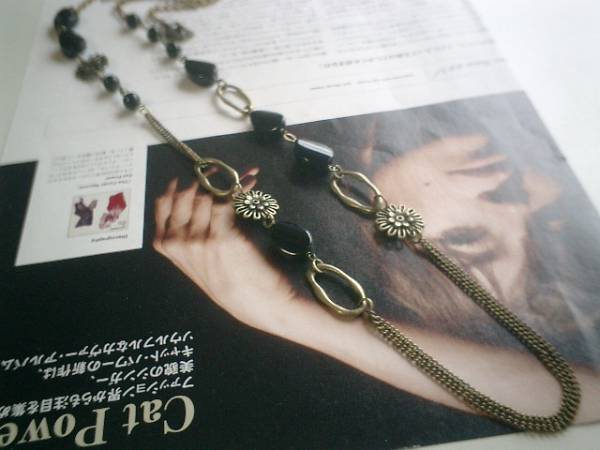 休日のシネマ・・シリーズです♪お気に入りのオニキス・・シックな秋色のオニキスのネックレスです♪♪丸玉やオーバルなどデザイン違いのオニキスにお花のチェーンを合わせてロマンチックな表情です♪お花のチェーンには8ミリの丸玉、16ミリのフラットオーバルのオニキスを合わせました♪長さは全長96センチ位で調節自由です♪2連にされても素敵です♪お揃いのネックレスやブレスレットも出品しています♪シンプルで合わせやすいデザインを考えました♪ハンドメイドをご理解いただいてノークレーム、ノーリターンでお願いします♪