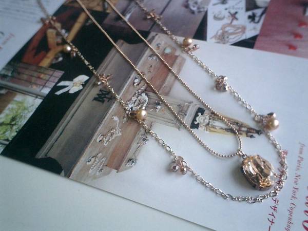 クレアの衣装箱・・シリーズです♪パール・レッスンⅤ・・さりげなく華やかなベージュピンクの淡水パールとスワロやチェコビーズのネックレス2点セットです♪色々な組み合わせで楽しんでいただけます♪♪ピンクゴールドのチェーンを合わせて甘すぎない大人のロマンチックしています♪6ミリ位のポテトの淡水パールには3ミリ、4ミリのチェコビーズを合わせました♪長さは75センチ+アジャスター10センチで最長85センチ位です♪18ミリ×13ミリのスワロは極小のピンクゴールドのボールチェーンを合わせました♪長さは68センチ+アジャスター12センチで最長80センチ位です♪それぞれ単品やネックレス、ブレスレットやイヤリングも出品しています♪シンプルで長く着けていただけるデザインを考えて作りました!ハンドメイドをご理解頂いてノークレーム、ノーリターンでお願いします