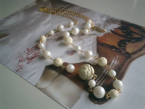 コゼットの裁縫箱・・シリーズです♪やさしい夢を見て・・ふんわりやさしいオフ・ホワイトのネックレス2点セットです♪色々な組み合わせで楽しんでいただけます♪マットな樹脂パールや編みフラワー、樹脂薔薇や編みボールやサテンボール、彫りボーンなどを集めてロマンチックな表情です♪真ん中の画像の編みフラワーのネックレスは12ミリから43ミリ位までのサテンボールや編みボール、編みフラワーを合わせました♪長さは全長70センチ位で調節自由です♪右端の大きな樹脂薔薇のネックレスは8ミリから12ミリ位までのマット樹脂パールに17ミリ位の樹脂薔薇、12ミリの彫りボーンを合わせました♪長さは全長77センチ位で調節自由です♪どちらもホワイト・ベージュ色でまとめてふんわりやさしい表情です♪それぞれ単品でも出品しています♪♪お揃いのブレスレットも出品しています♪シンプルで飽きのこないいつまでも着けられるデザインを考えて作りました!ハンドメイドをご理解頂いてノークレーム、ノーリターンでお願いします