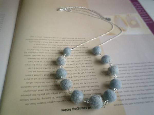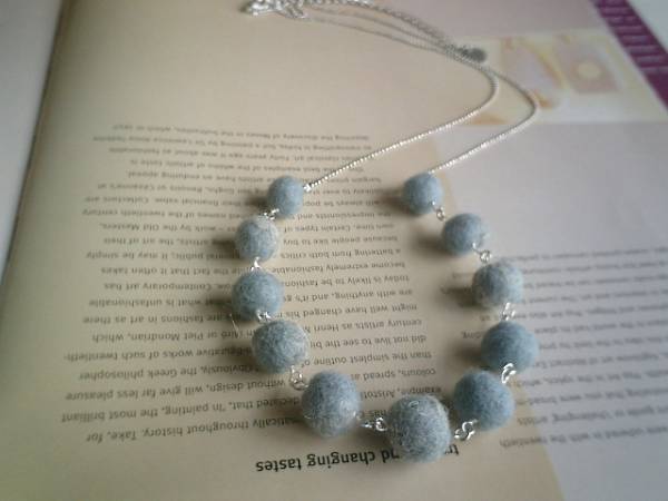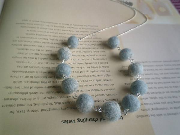 お気に入りのフォルム・・シリーズです♪水色に恋して・・ふんわりやさしいフェルト玉のネックレスです♪ブルーグレーの小さなフェルト玉を繋いでシンプルなデザインです♪フェルト玉は11ミリから15ミリ位までの大きさ違いです♪華奢なボールチェーンを合わせました♪長さは68センチ+アジャスター12センチで最長80センチ位です♪お揃いのブレスレットやイヤリングも出品しています♪シンプルで飽きのこないいつまでも着けられるデザインを考えて作りました!ハンドメイドをご理解頂いてノークレーム、ノーリターンでお願いします