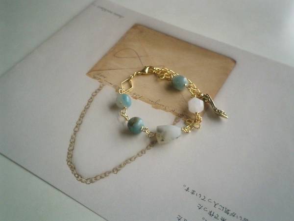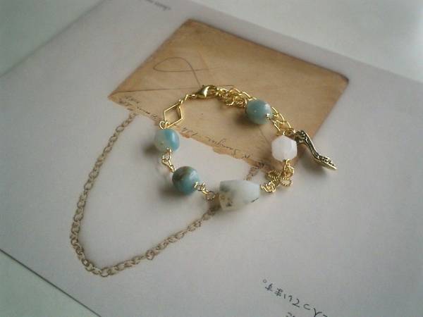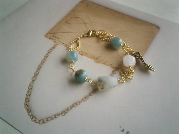 ロマンチックを集めて・・シリーズです♪6月の水色・・儚げなアマゾナイトのブレスレットです♪シックな水色のアマゾナイトにブルーオパールやデザイン・チェーンを合わせてアンニュイな表情です♪アマゾナイトは10ミリから11ミリ位のラフ・タンブル、ブルーオパールはラフ・カットです♪長さは全長23センチ位で調節自由です♪お揃いのネックレスも出品しています♪シンプルで飽きのこないいつまでも着けられるデザインを考えて作りました!ハンドメイドをご理解頂いてノークレーム、ノーリターンでお願いします