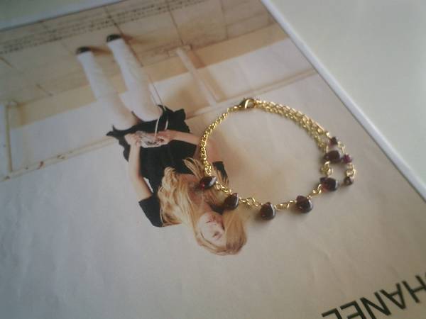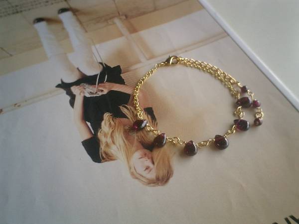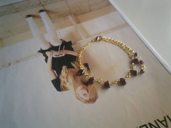 女の子の憧れ・・シリーズです♪深い赤のガーネットのブレスレットです♪華奢なゴールドのチェーンを合わせて可憐な表情です♪ガーネットは6×8ミリ位のフラットドロップです♪長さは16センチ+アジャスター6センチで全長22センチ位です♪お揃いのネックレスも出品しています♪♪シンプルで飽きのこないいつまでも着けられるデザインを考えて作りました!ハンドメイドをご理解頂いてノークレーム、ノーリターンでお願いします