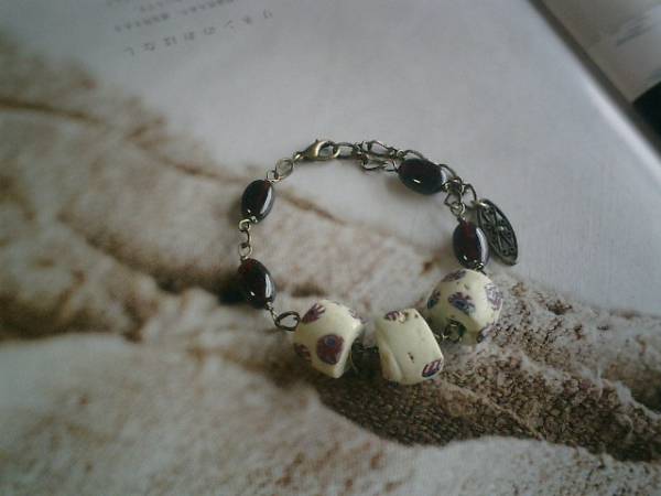 ビター・スィート・・シリーズです♪ガーネットととんぼ玉・・シックなガーネットとアンティークのとんぼ玉のブレスレットです♪深い赤のガーネットに可憐な柄のアンティークのとんぼ玉を合わせてロマンチックな表情です♪ガーネットは12×8ミリ位のオーバルです♪とんぼ玉は11ミリ位です♪長さは全長23センチ位で調節自由です♪お揃いのネックレスやイヤリングも出品しています♪シンプルで長く着けていただけるデザインを考えて作りました♪ハンドメイドをご理解頂いてノークレーム、ノーリターンでお願いします |