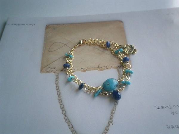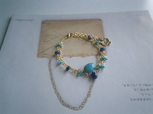 やさしい時間・・シリーズです♪お気に入りの石・・シックなターコイズの2連のブレスレットです♪トルコブルーのターコイズに濃紺のラピスを合わせて可憐な表情です♪ターコイズのさざれにはラピスのさざれ、トップは10×7ミリ位のラピスのドロップカットです♪華奢なチェーンのトップは12×8ミリ位のターコイズのタンブルです♪長さは16センチ+アジャスター7センチで最長23センチ位です♪お揃いのネックレスやピアスも出品しています♪シンプルで飽きのこないいつまでも着けられるデザインを考えて作りました!ハンドメイドをご理解頂いてノークレーム、ノーリターンでお願いします