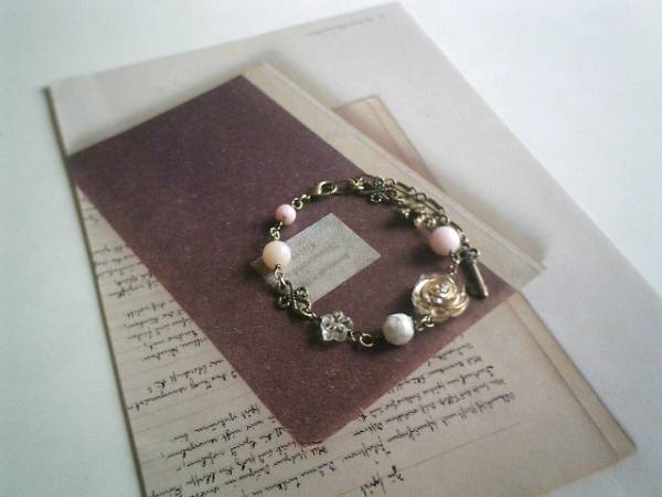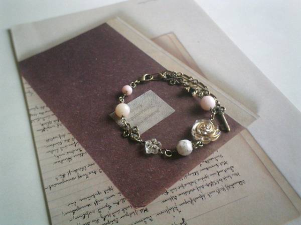 ジャンヌのコレクション・・シリーズです♪やさしいピンク・・ふんわりやさしいピンクオパールのブレスレットです♪アンティークビーズや樹脂薔薇やチェコビーズをデザインチェーンで繋いでアンティークな表情です♪オパールは6ミリ、8ミリの丸玉、アンティークビーズは8ミリ、10ミリ、樹脂薔薇は14ミリ位です♪長さは全長23センチ位で調節自由です♪お揃いのネックレスも出品しています♪シンプルで長く着けていただけるデザインを考えて作りました!ハンドメイドをご理解頂いてノークレーム、ノーリターンでお願いします