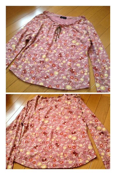 カットソーは落ち着いたピンクに花柄総柄です。