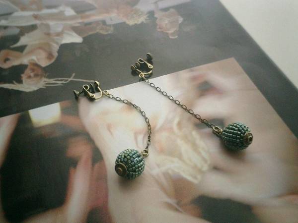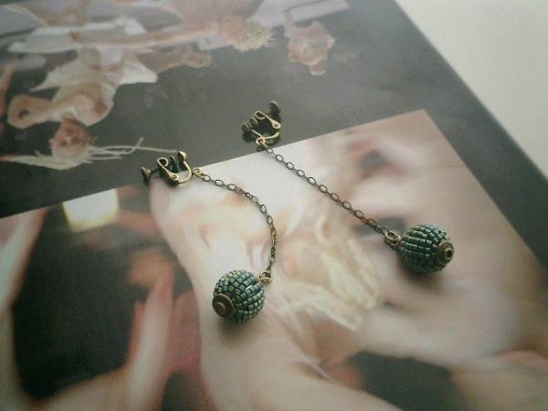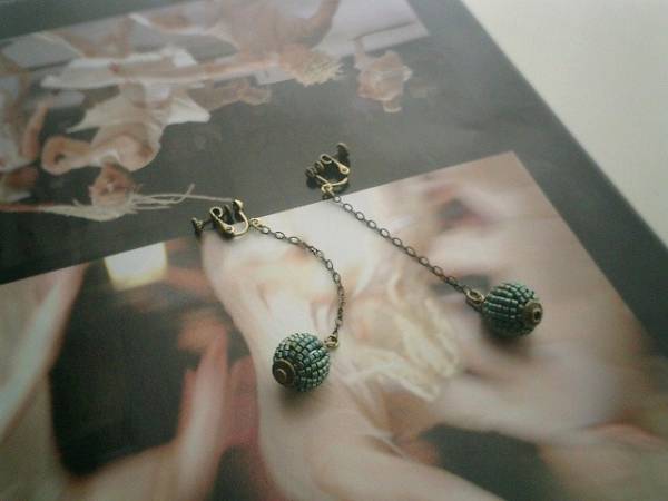 ニューヨーク・デッサンシリーズです♪キュートなターコイズ色のイヤリングです♪♪シックなお色でまとめて大人のロマンチックしています♪13ミリ位のターコイズ色のビーズボールはデザインメタルでおめかししてノスタルジックな表情です♪長さ8・5センチ位です♪♪ピアスにも変更出来ます♪お揃いのネックレスやブレスレットも出品しています♪シンプルで飽きのこないいつまでも着けられるデザインを考えて作りました!ハンドメイドをご理解頂いてノークレーム、ノーリターンでお願いします