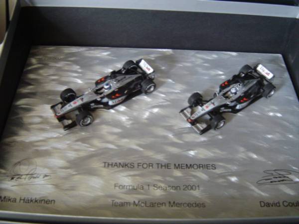ミニチャンプス製、2001年シーズンのマクラーレンメルセデスMP4-16、M・ハッキネン、D・クルサード2台セットです。外箱、本体ともに美品です。500台限定のシリアル№144です。ミニカーは大量生産品のため、デカール等個体差が生じてしまうことをご理解のうえ入札願います。完全品をご希望の方は、入札をご遠慮ください。ゆうパックにて発送します。東京都内700円、東北・関東(東京都以外)・信越・北陸・東海は760円、近畿は870円、中国・四国は1,030円、北海道・九州は1,290円、沖縄は1,330円となります。まとめて落札いただいた場合は、別途連絡します。