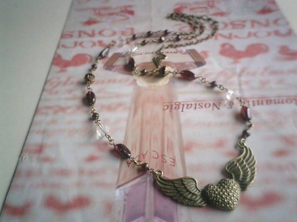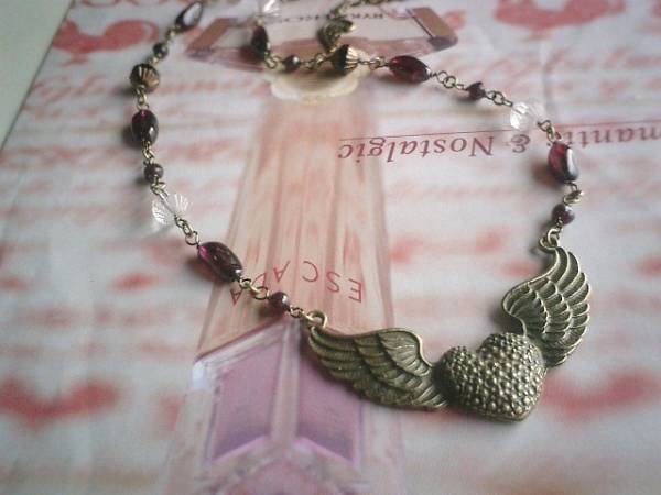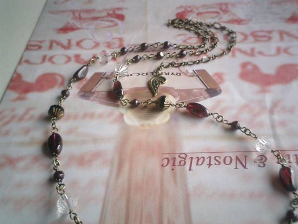 やさしい時間・・シリーズです♪ガーネットと天使・・深い赤のガーネットのネックレスです♪チェコビーズやトップに天使の羽根を合わせてロマンチックな表情です♪ガーネットは5ミリの丸玉、7×12ミリ位のラフ・タンブルです♪長さは全長74センチ位で調節自由です♪チョーカー風に着けられても素敵です♪お揃いのブレスレットも出品しています♪シンプルで飽きのこないいつまでも着けられるデザインを考えて作りました!ハンドメイドをご理解頂いてノークレーム、ノーリターンでお願いします