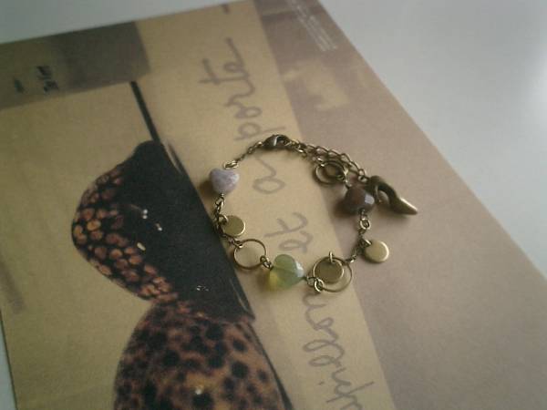 ルーズ・シルエット・・シリーズです♪シックなハート・・キュートなハートのインディアン・アゲートとメタル・コインのブレスレットです♪♪インディアン・アゲートは10ミリのハート・カットです♪8ミリのメタル・コインやデザインリングを合わせてニューヨーク・モダンしています♪長さは全長23センチ位で調節自由です♪♪お揃いのネックレスやピアスも出品しています♪シンプルで飽きのこないいつまでも着けられるデザインを考えて作りました!ハンドメイドをご理解頂いてノークレーム、ノーリターンでお願いします |