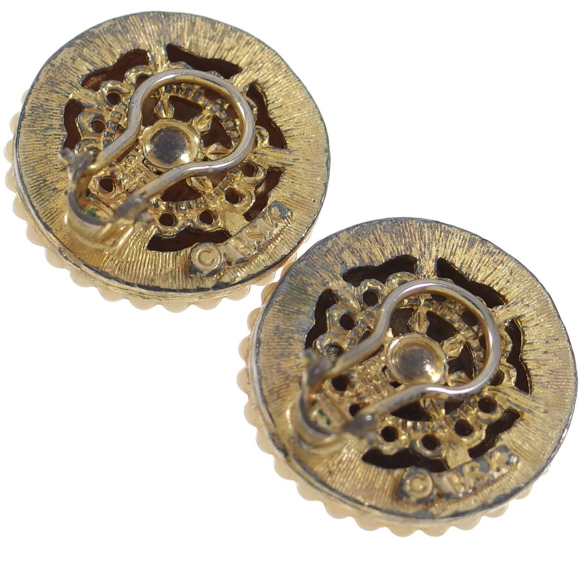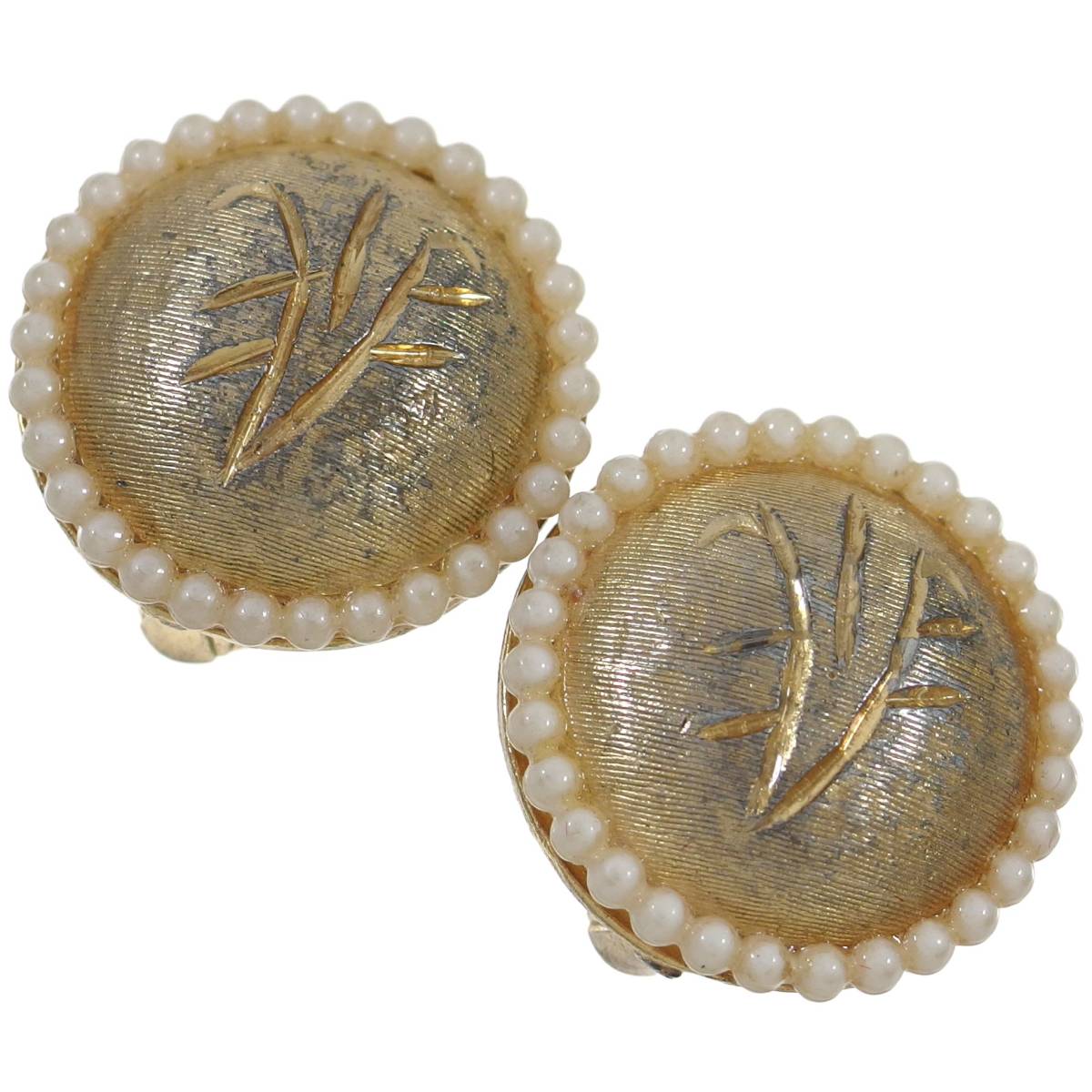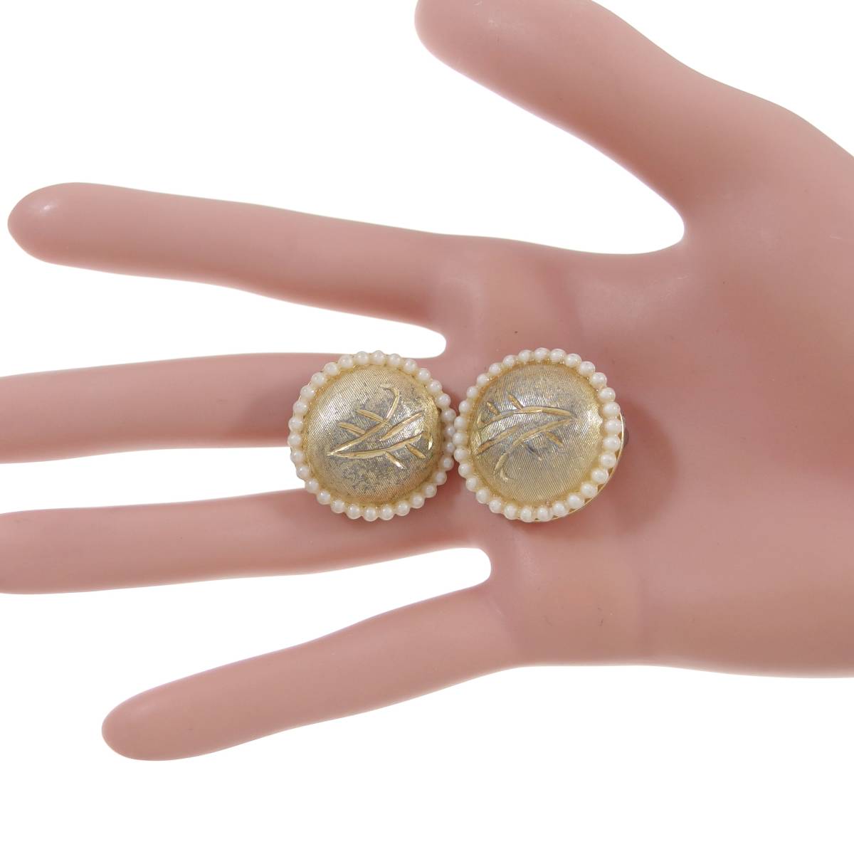 A6156◆【BSK】◆ 葉っぱの彫刻模様 * フェイクパールの飾り ◆ リーフモチーフ ◆ ヴィンテージイヤリング ◆