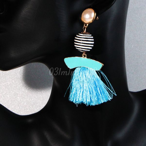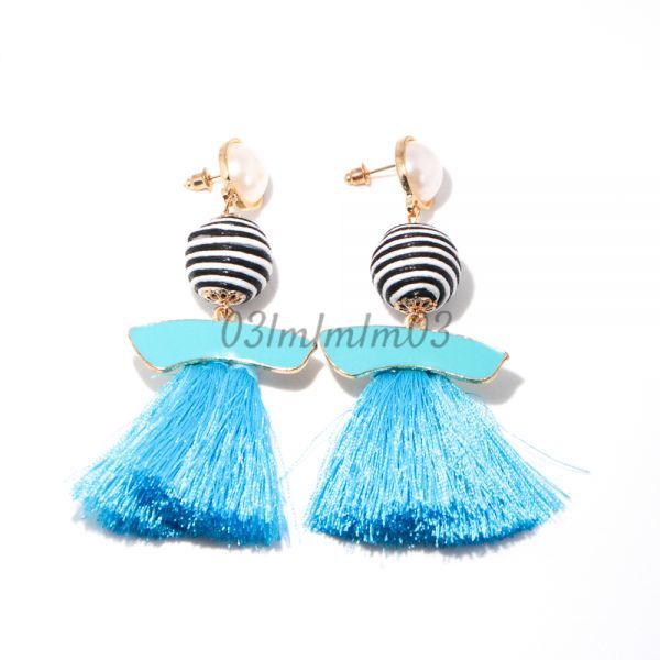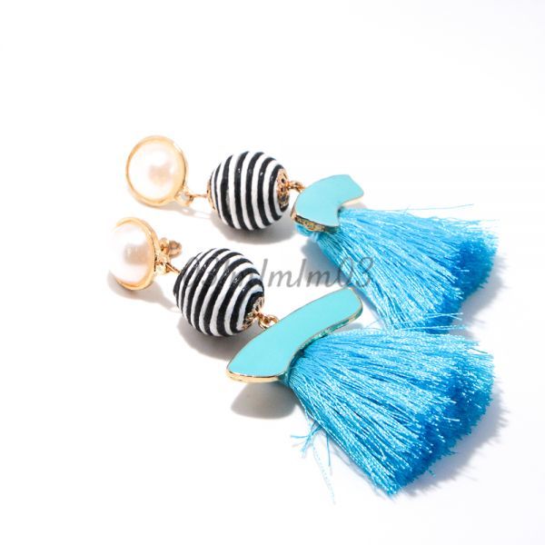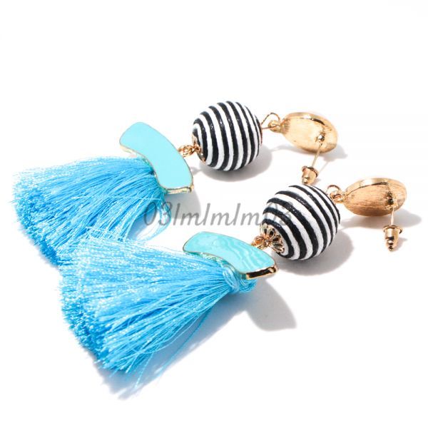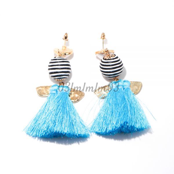 【送料無料】ピアス アクアブルー フリンジ ストライプボール エナメル 大ぶり ポストピアス 耳飾り レディース インポートアクセサリー
