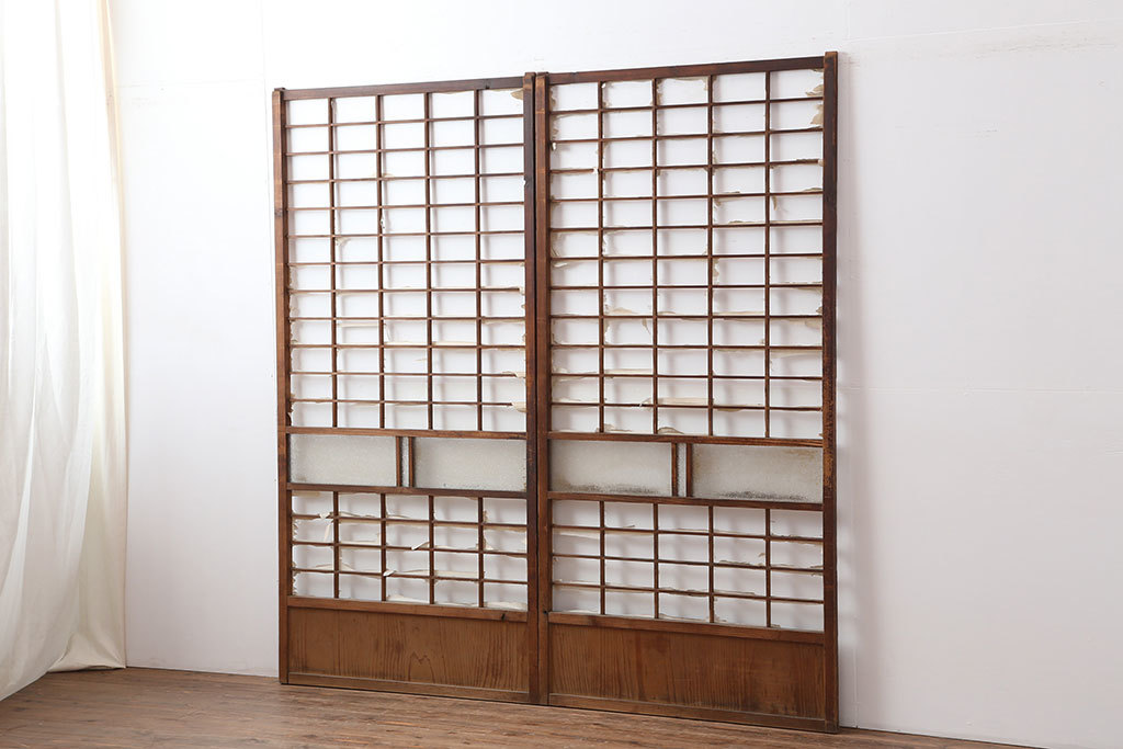 R-036789 アンティーク建具 昭和初期 シンプルな木製フレームの障子戸2枚セット(建具、引き戸)(R-036789)