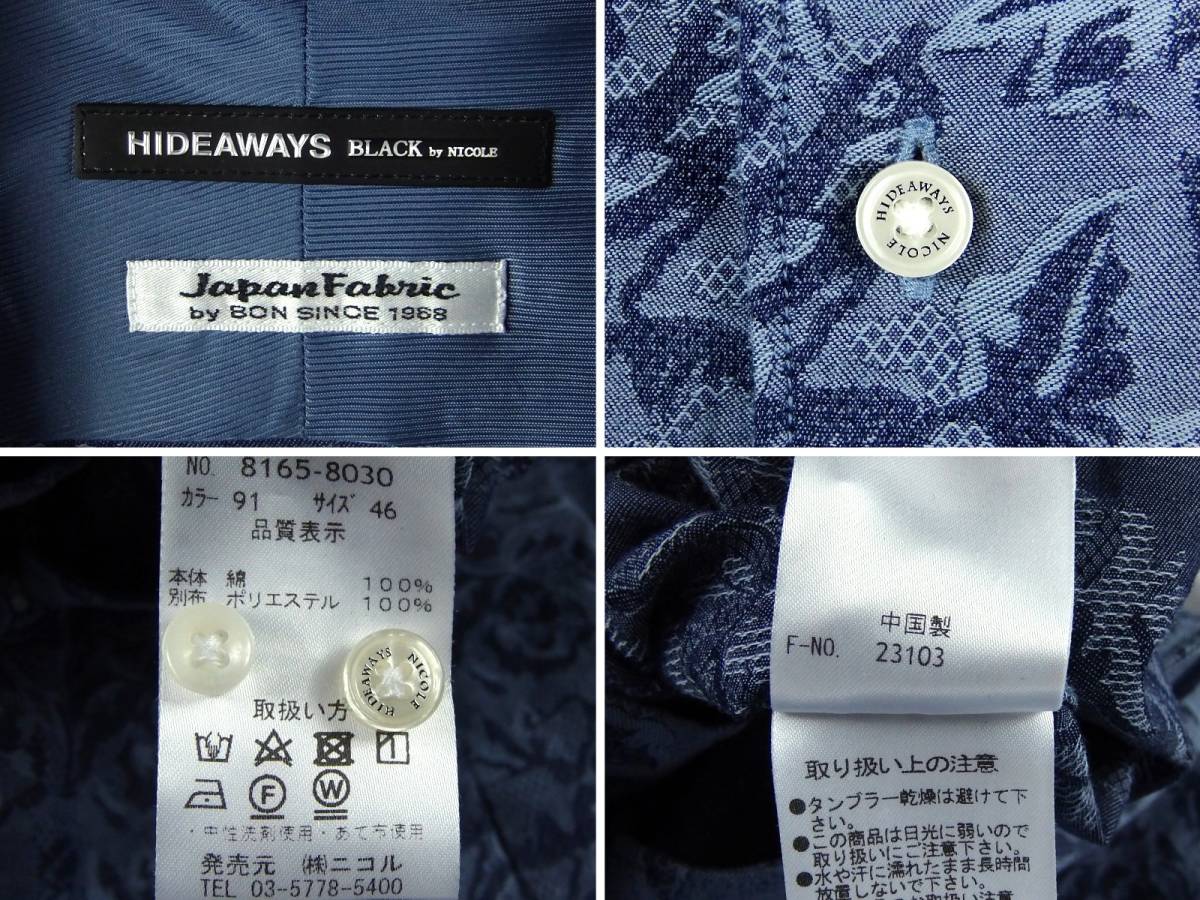 | 商品説明 | ■商品について ブランド名:HIDEAWAYS BLACK by NICOLE 販売元:(株)ニコル 生産国:MADE IN CHINA サイズ:46 カラー:ブルー 素材:綿 100% 品番:8165-8030 ・衿 ホリゾンタルカラー ・ジャガード 花柄生地 ・背中 ダーツ入り ハイダウェイニコルのブラックライン、 大花柄のジャガード素材で仕立てたホリゾンタルカラーのシャツ、 繊細な柄を綺麗に表現し、上品な光沢と高級感を演出してくれます。 全体的にスッキリとしたサイズ感で着用時のシルエットも◎、 着こなしの幅が広いアイテムなのでお勧めですよ。 是非この機会にご購入を検討頂けますと幸いです。 表記サイズ:46 肩幅:約42.5cm (両肩直線) 身幅:約50.5cm (脇下) 身幅:約45cm (胴幅) 袖丈:約64.5cm 着丈:約70cm (後身 衿付根から) ※平置にて計測 ※素人採寸のため多少の誤差はお許し下さい ■状態について 全体的に着用に伴う使用感はありますが、 まだまだ問題なく着用頂ける状態です。 中古品のため少しでも状態を気にされる方、 完璧な商品をお求めの方は入札をお控え下さい。 -------------------------------------------------------------------- 他にも衣料品を中心に出品させて頂いております。 複数落札して下さった場合には、まとめて発送させて頂きますので、 送料がお得になります。⇒【出品リスト】 |