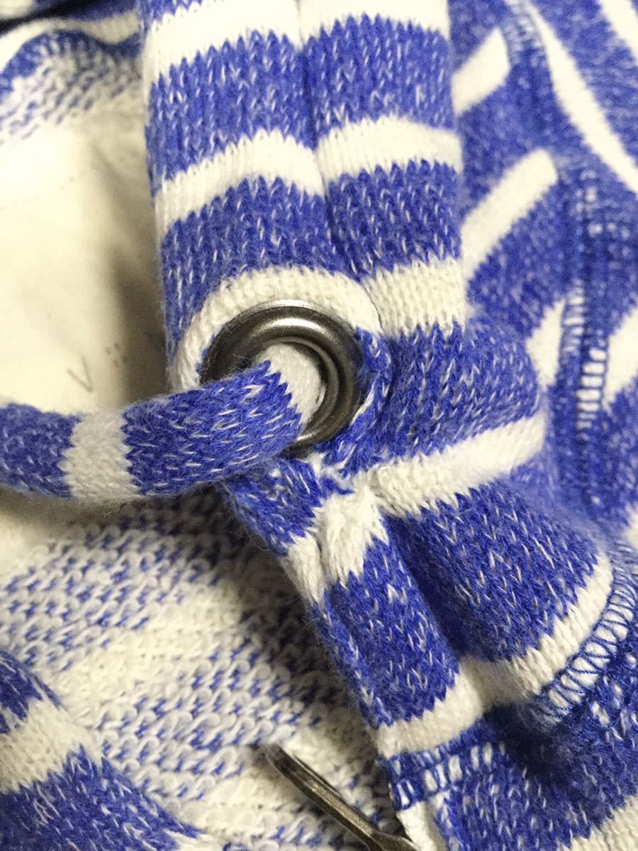 また、写真9には、フードのドローコード左側のハトメ金具の周りに解れをリペアした跡が見受けられます。