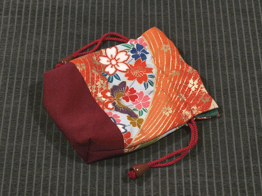 沈んだ深緋(こきひ)色の縮緬地と、淡い藤鼠(ふじねず)色の地に菊や牡丹、梅、椿、桜などの草花と蝶の文様が染められた縮緬地が合わせられた、縮緬の巾着です。 使用感はなく、未使用保管品と思われます。目につくしみやよごれ、褪色などのダメージもなく、新品同様にきれいです。 |